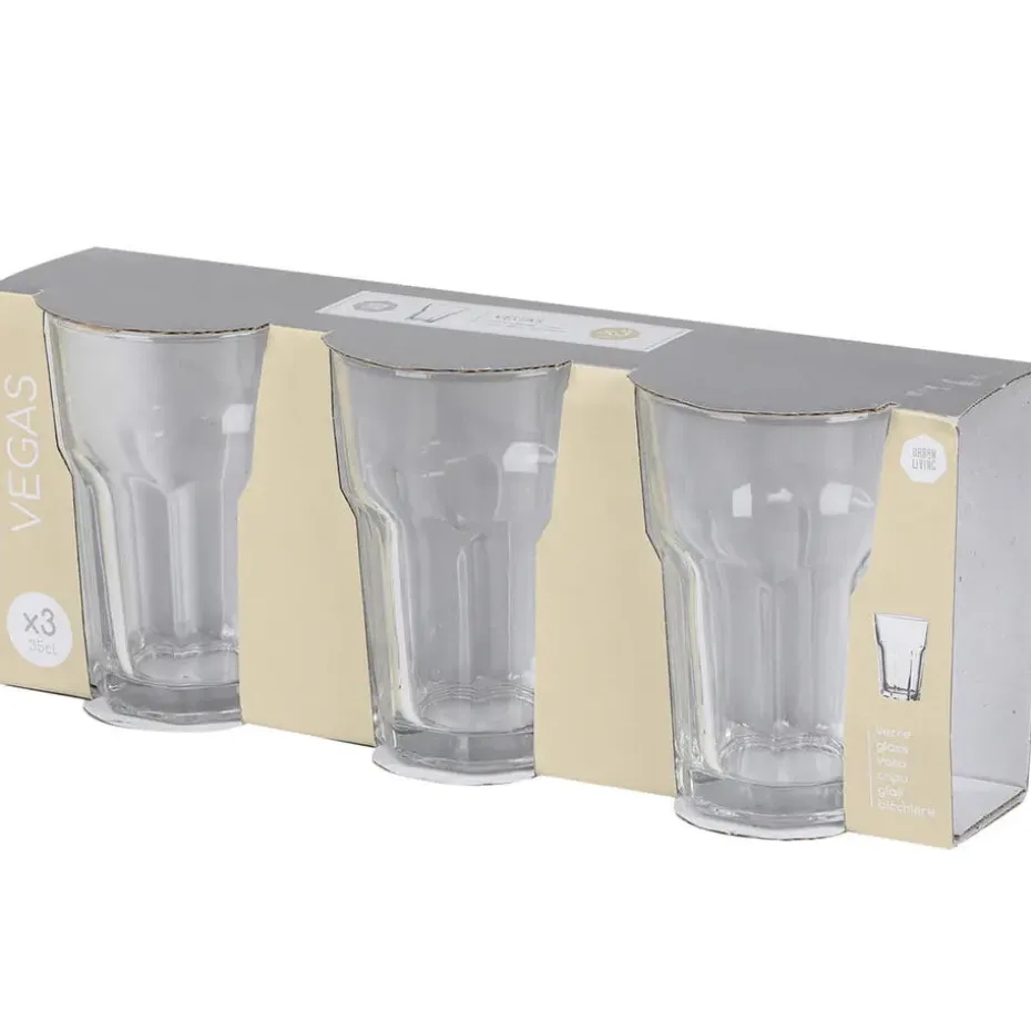 De Urban Living Vegas tumblers zijn perfect voor dagelijks gebruik in huis of horeca. Deze set van 3 glazen is gemaakt van helder transparant glas en heeft een inhoud van 350 ml per glas. Door het moderne design en stevige vorm liggen ze prettig in de hand. Geschikt voor water, sap of frisdrank en eenvoudig te reinigen dankzij de vaatwasmachinebestendigheid. Een praktische en stijlvolle toevoeging aan elk servies.