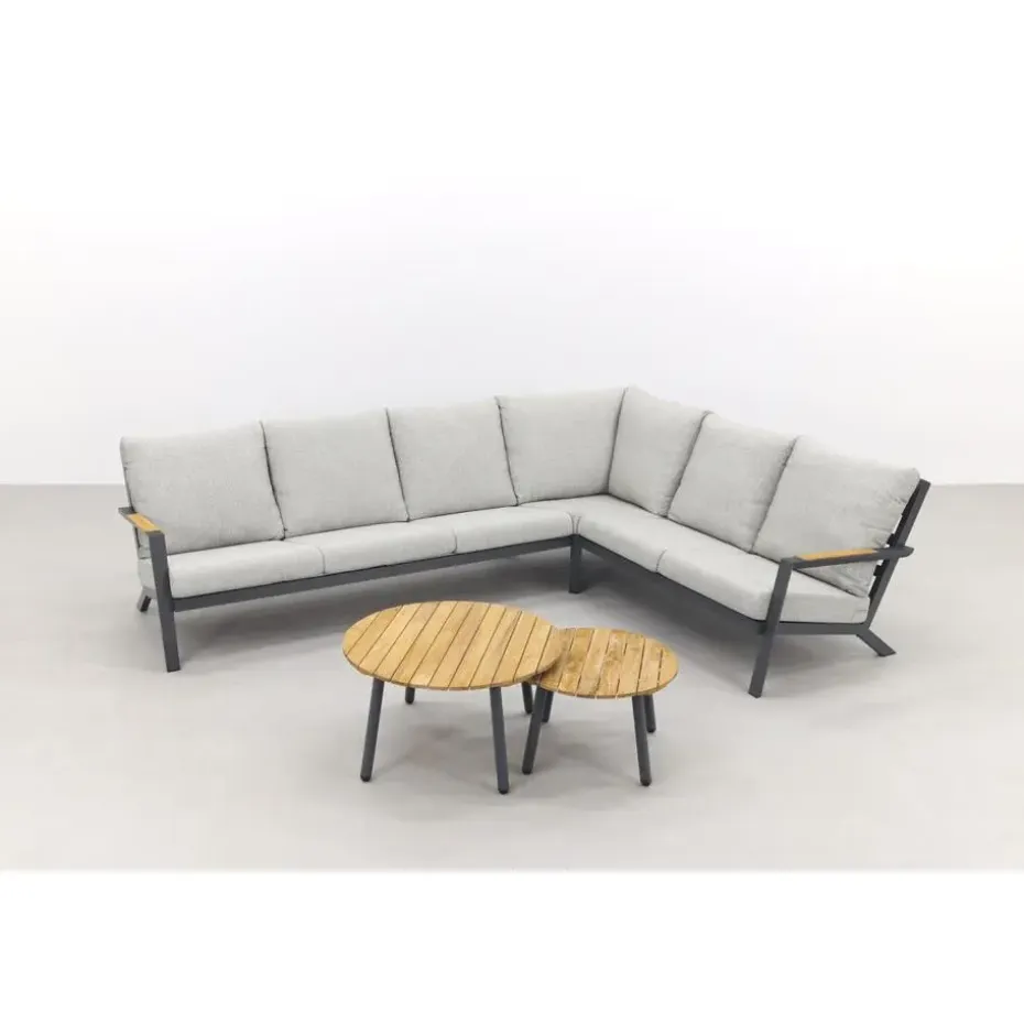 Zoek jij een luxe loungeset voor een betaalbare prijs? Dan is de Santos/Mindo loungeset de ideale keuze! Deze loungeset straalt een tijdloze charme uit door de strakke lijnen en antraciete kleur. Met de teakhouten details krijgt deze set toch een vleugje warmte mee. Dit teakhout zie je terug in de armleuningen en het tafelblad. Hierdoor past dit geheel ook echt perfect bij elkaar. De Mindo tafels zijn licht van gewicht en daardoor makkelijk te verplaatsen. Ook in jouw tuin hebben staan? Bestel direct online!