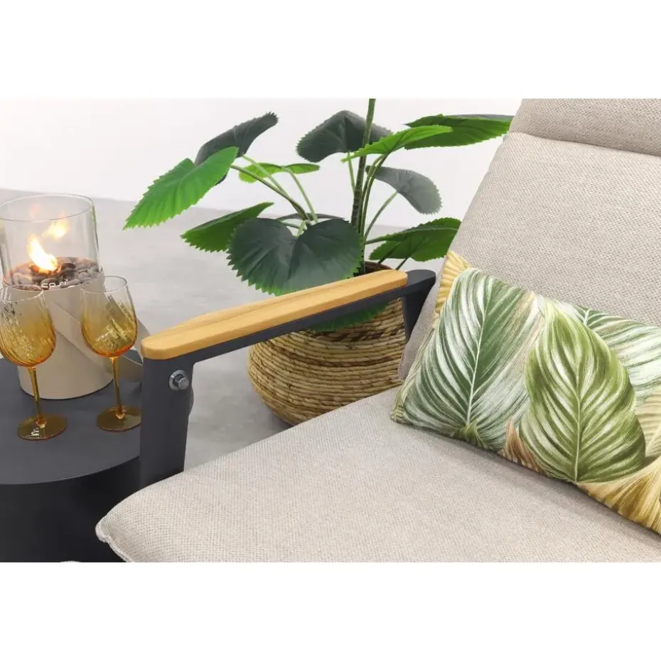 De Solaro loungestoelen zijn perfect om heerlijk in te ontspannen. Het frame is gemaakt vanlichtgewicht aluminiumin een stoere antracietkleur –helemaal weerbestendig, dus ideaal voor buiten! De teakhouten armleuningen geven eengezellige, landelijke uitstraling, terwijl de rugleuning met rope-design zorgt voor eenspeels en stijlvoldetail. De dikke,comfortabele kussenszijnbestand tegen een buitjeen hebben een prachtige zandkleur die overal bij past.
