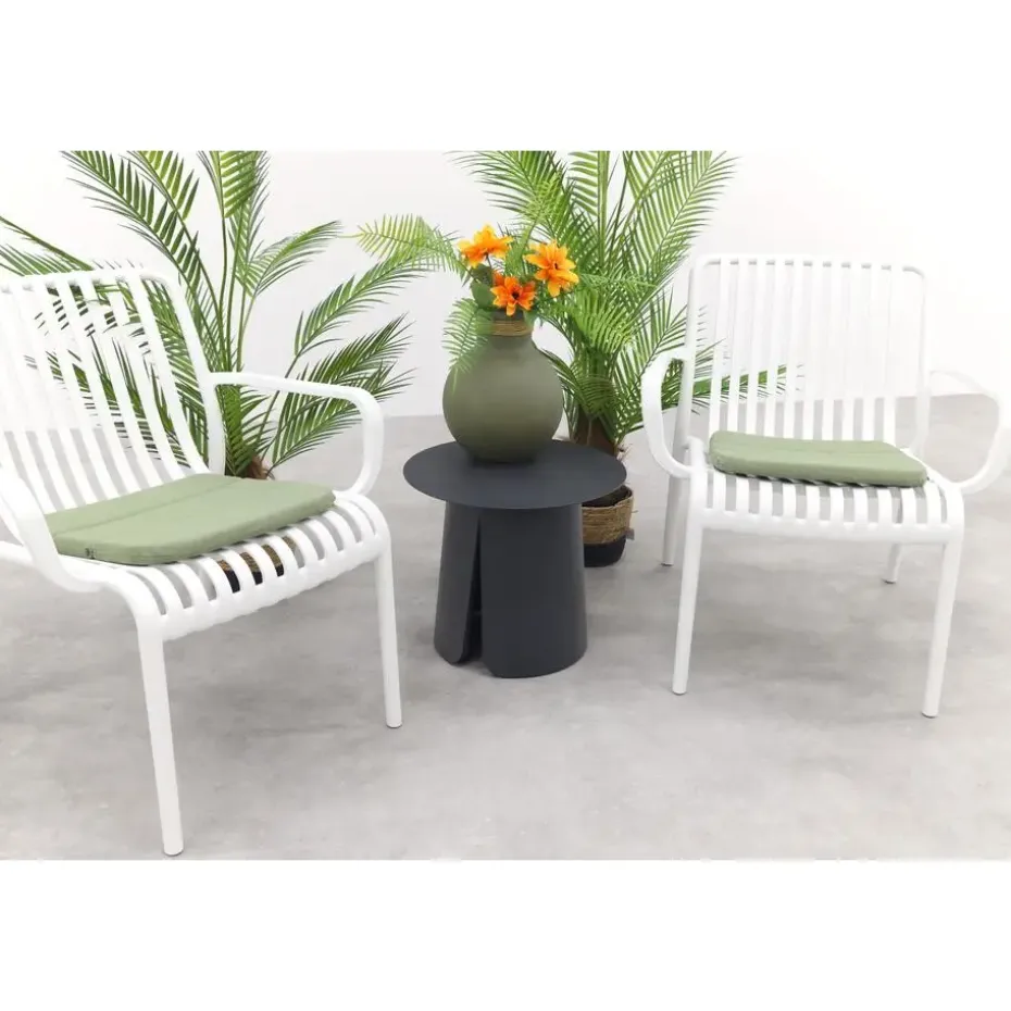 Geef je tuin of balkon een frisse en stijlvolle look met de Stripe loungestoelen in wit en de Velora koffietafel! De witte loungestoelen bieden heerlijk zitcomfort en vallen op door het moderne, open design met subtiele strepen. De Velora koffietafel Ø45 cm, met zijn lichte aluminium en unieke split-onderstel, voegt een stoer en eigentijds accent toe aan je buitenruimte. Deze compacte set is ideaal voor kleine hoekjes en brengt direct sfeer en gezelligheid.