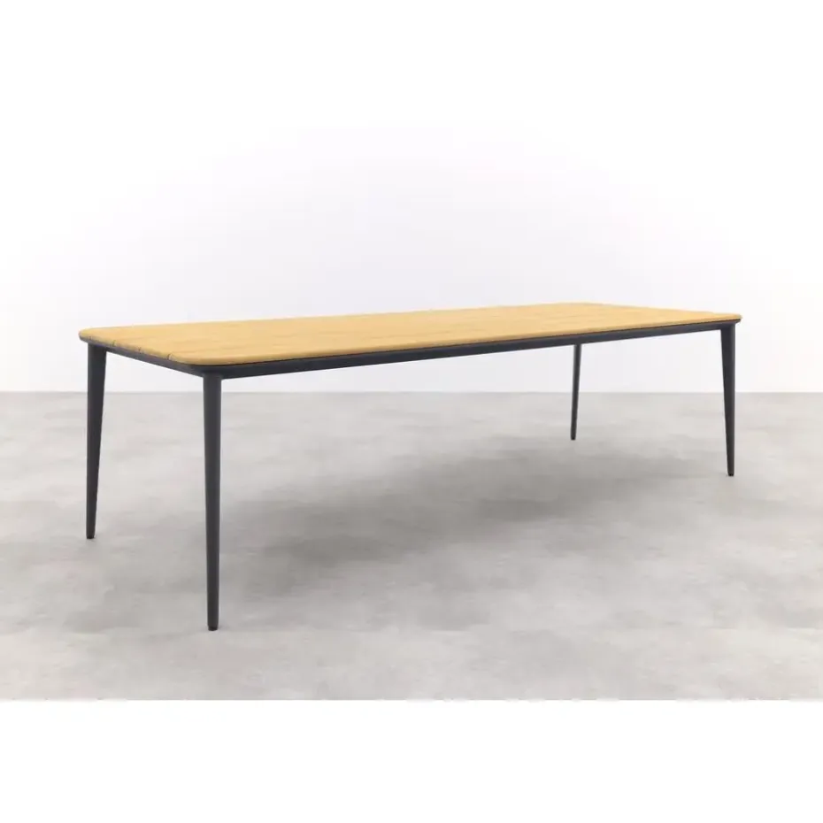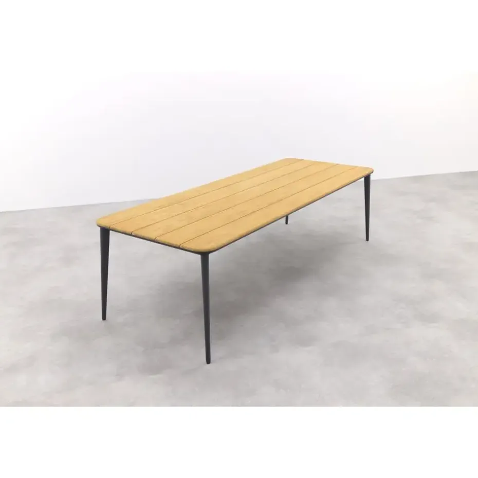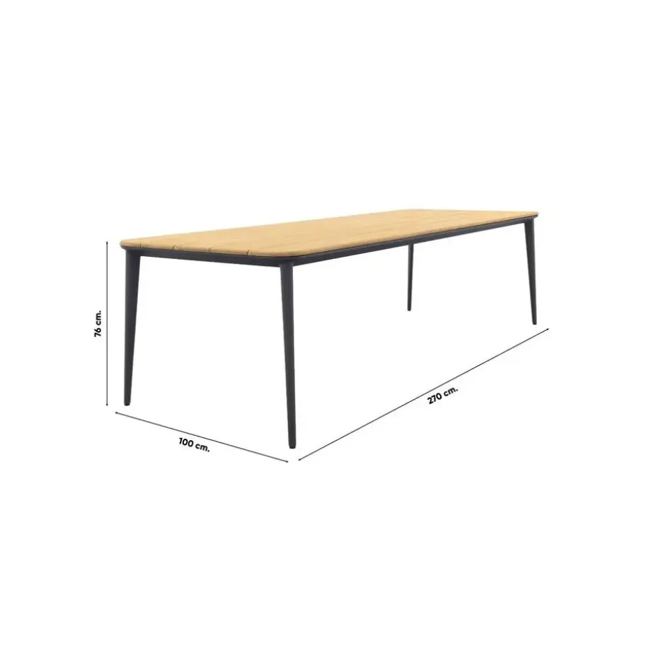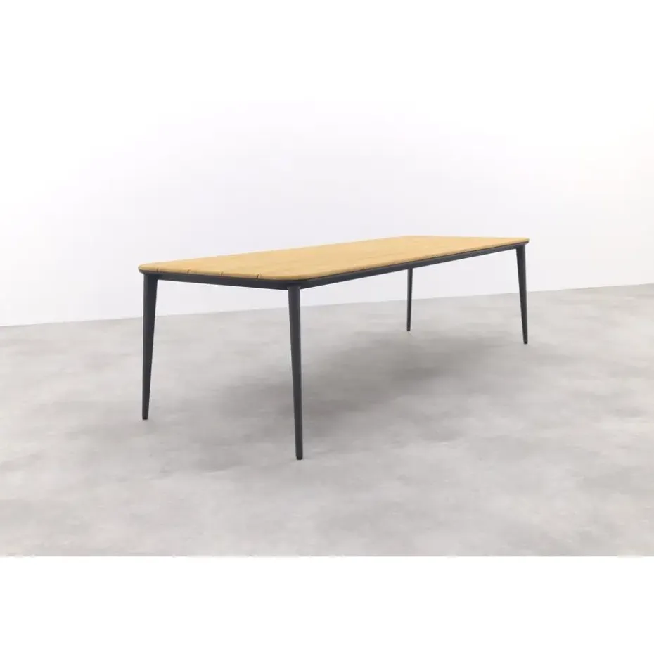 De Alaska tuintafel is een schitterende combinatie van een teakhouten tafelblad en een aluminium frame. Het warme, bruine tafelblad creëert een gezellige sfeer. Teakhout is natuurlijk materiaal dat na verloop van tijd natuurlijk kan gaan vergrijzen. Deze karakteristieke eigenschap past bij de charme van de tafel. De bruine kleur kun je eenvoudig terug krijgen door het juiste onderhoud. Het tafelblad ligt op een aluminium frame met taps toelopende poten. Aluminium heeft als voordelen dat het licht van gewicht is, onderhoudsvriendelijk en heel erg stevig.