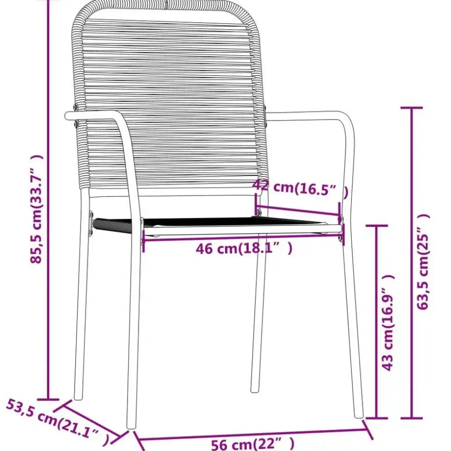 Deze tuinset heeft een gepoedercoat stalen frame waardoor de tafel en stoelen stabiel en duurzaam zijn. De rugleuning en zitting zijn gemaakt van getwijnd katoenen touw, dat zacht aanvoelt en duurzaam is. De tafel is voorzien van een gehard glazen tafelblad, dat gemakkelijk schoon te maken is met een vochtige doek en perfect is voor het plaatsen van maaltijden, drankjes of decoratieve items.