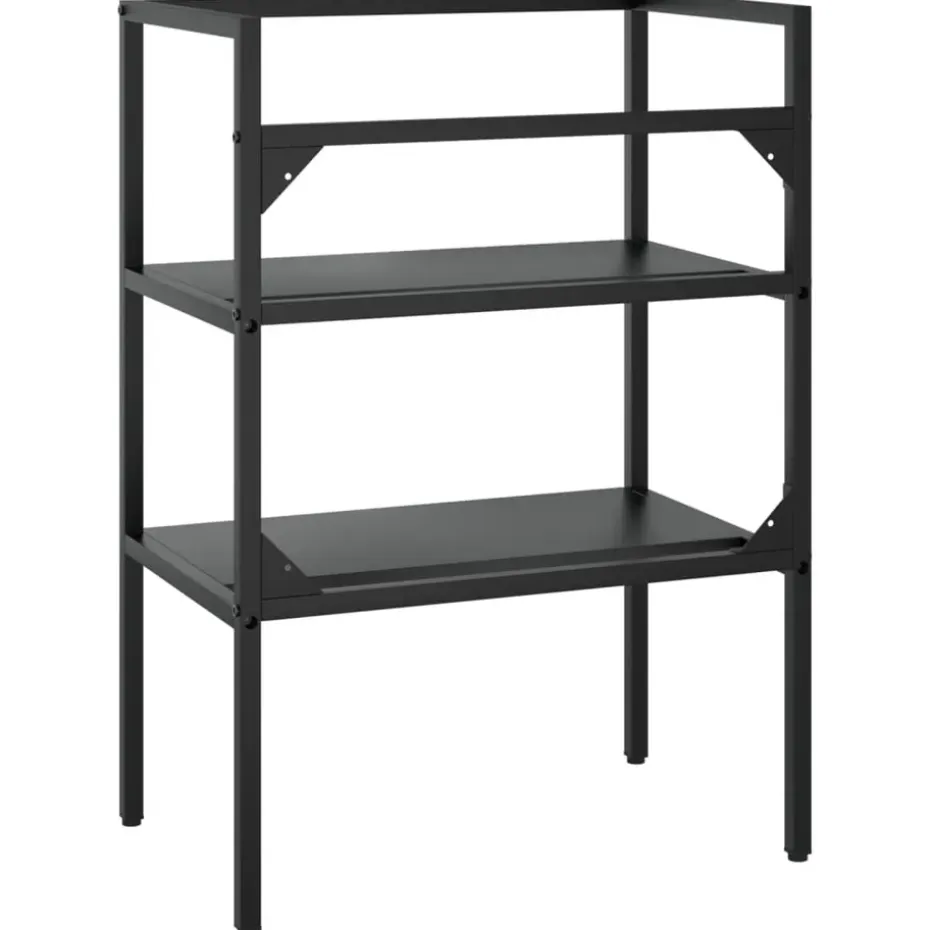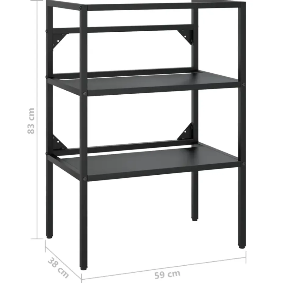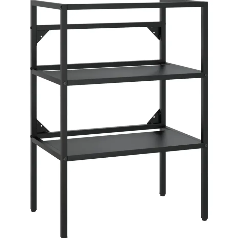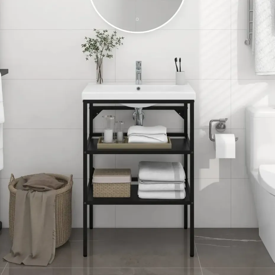 De wastafelstandaard is gemaakt van gepoedercoat ijzer en is weerbestendig en duurzaam. Het frame biedt gemakkelijke toegang tot handdoeken en manden en creëert meer ruimte dan gesloten opbergers. Het badkamerframe is gemakkelijk schoon te maken met een vochtige doek.