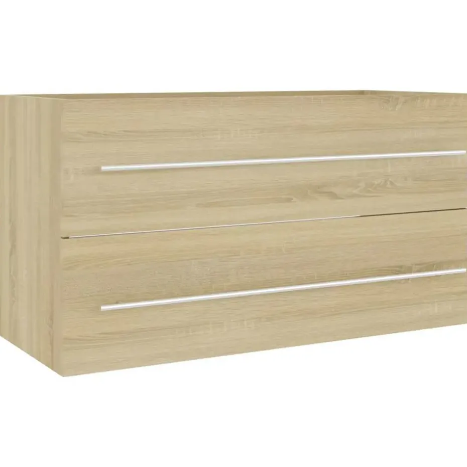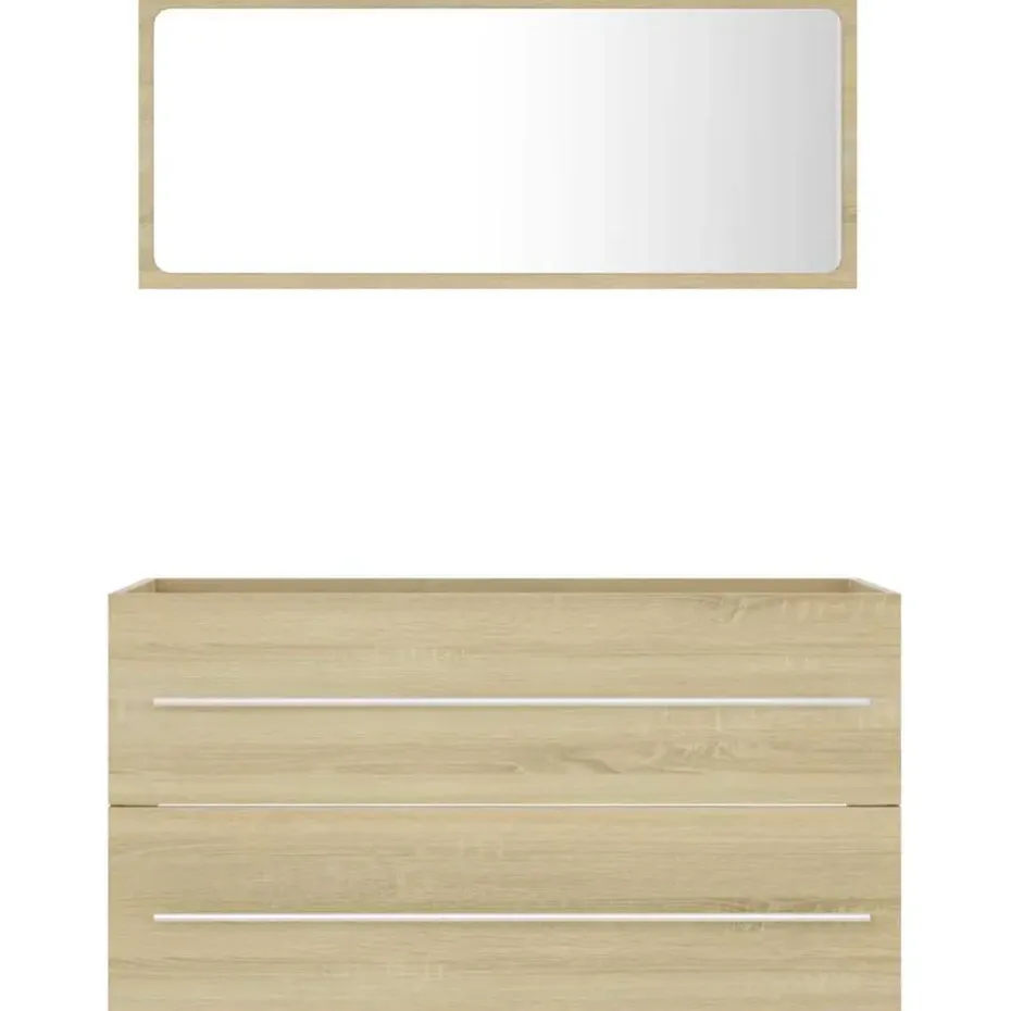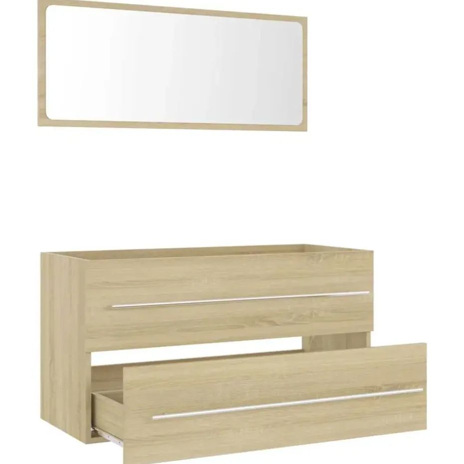 De meubelset, bestaande uit een spiegel en een kast, is gemaakt van duurzaam en stabiel spaanplaat. De chique kast is voorzien van 1 lade en biedt voldoende opbergruimte om spullen in je badkamer op te bergen. Het blad van de kast is ideaal voor het plaatsen van een wastafel. De spiegel geeft je interieur een prachtige uitstraling. Deze badkamerset is gemakkelijk schoon te maken met een vochtige doek.