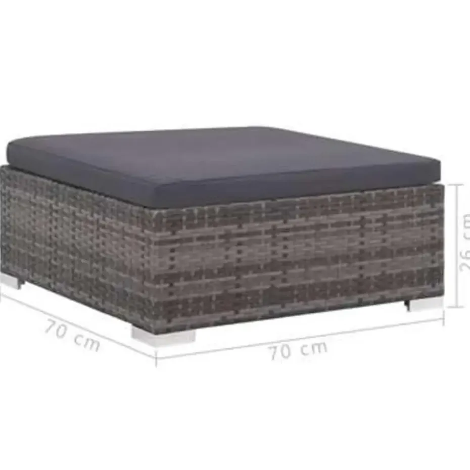 Deze poly rattan bankenset, bestaande uit 2 hoekbanken, 2 middenbanken, 1 salontafel, 1 hocker, 6 rugkussens en 5 zitkussens, is een stijlvolle loungeset voor je tuin of terras.