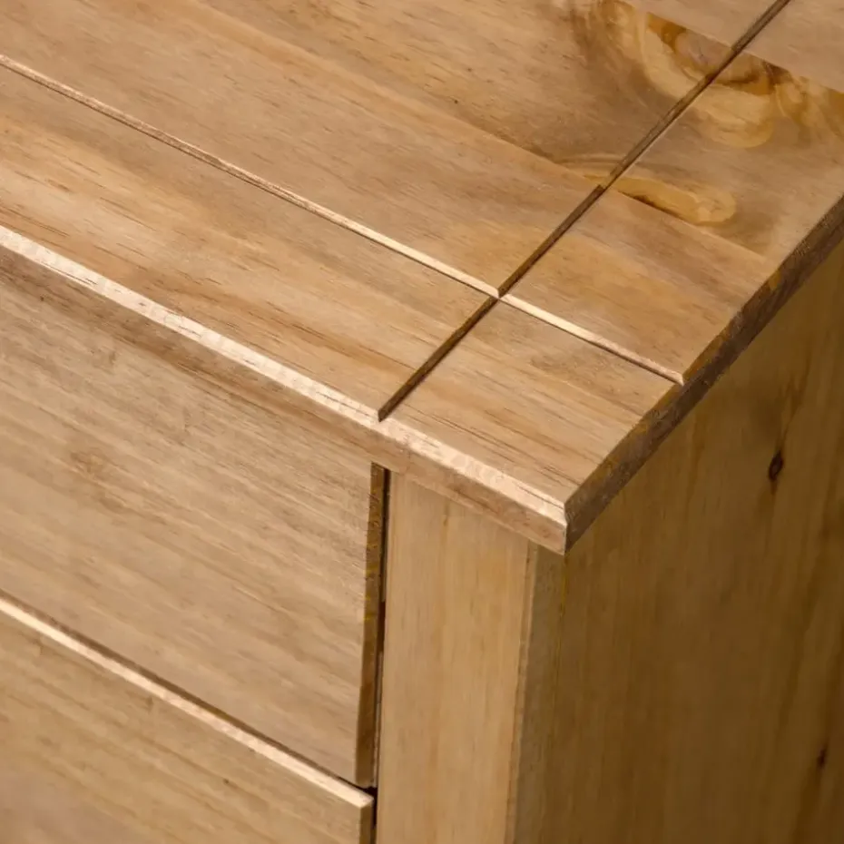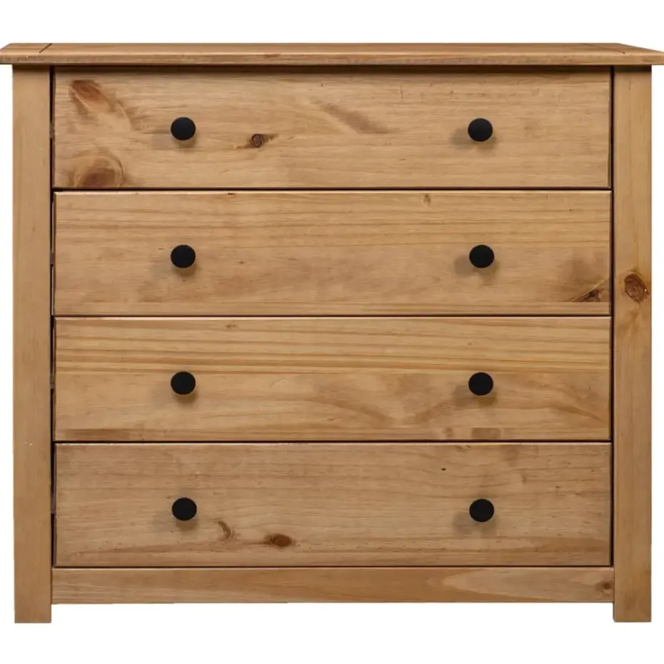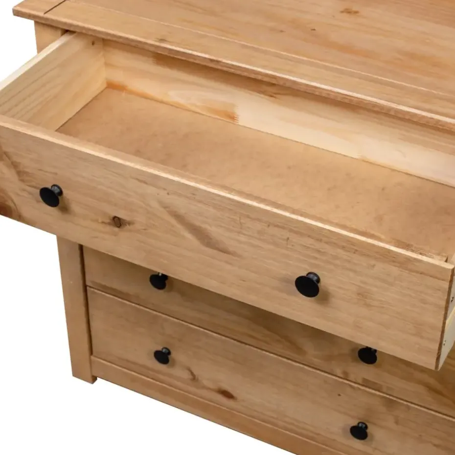 Deze Panama ladekast is gemaakt van massief grenenhout en is zeer duurzaam en stevig. Het dressoir biedt veel opbergruimte dankzij de 4 lades. Het stevige blad is ideaal voor het weergeven van decoratieve objecten, fotolijsten en potplanten. Hij is gemakkelijk schoon te maken met een droge doek. De kast is eenvoudig te monteren.
