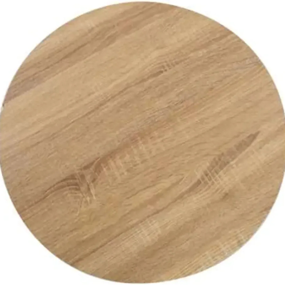 Het tafelblad is gemaakt van MDF met houtnerfpatroon en wordt ondersteund door een stalen poot en basis. Hij is gemakkelijk schoon te maken met een vochtige doek. Gebruik de tafel als aanvulling op je interieur, restaurant, koffiebar of lunchroom.