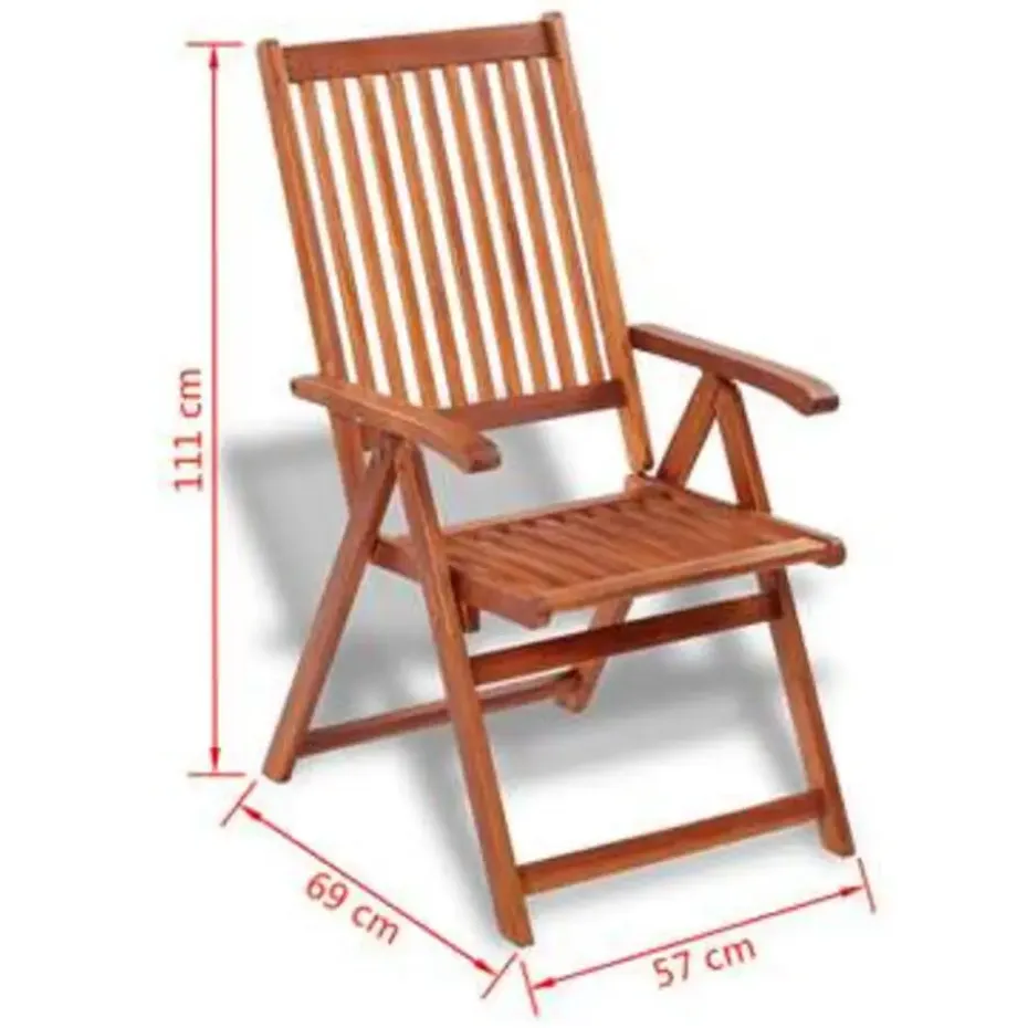 De eettafelset is gemaakt van hoogwaardig acaciahout, een tropisch hardhout. Dit acaciahout is waterbestendig en gaat vele jaren mee. De olie afwerking is makkelijk schoon te maken met een vochtige doek. De stoel is verstelbaar; de keuze uit 5 posities zorgt voor optimaal zitcomfort. De stoelen zijn ook inklapbaar, zo kan je ze eenvoudig opbergen.
