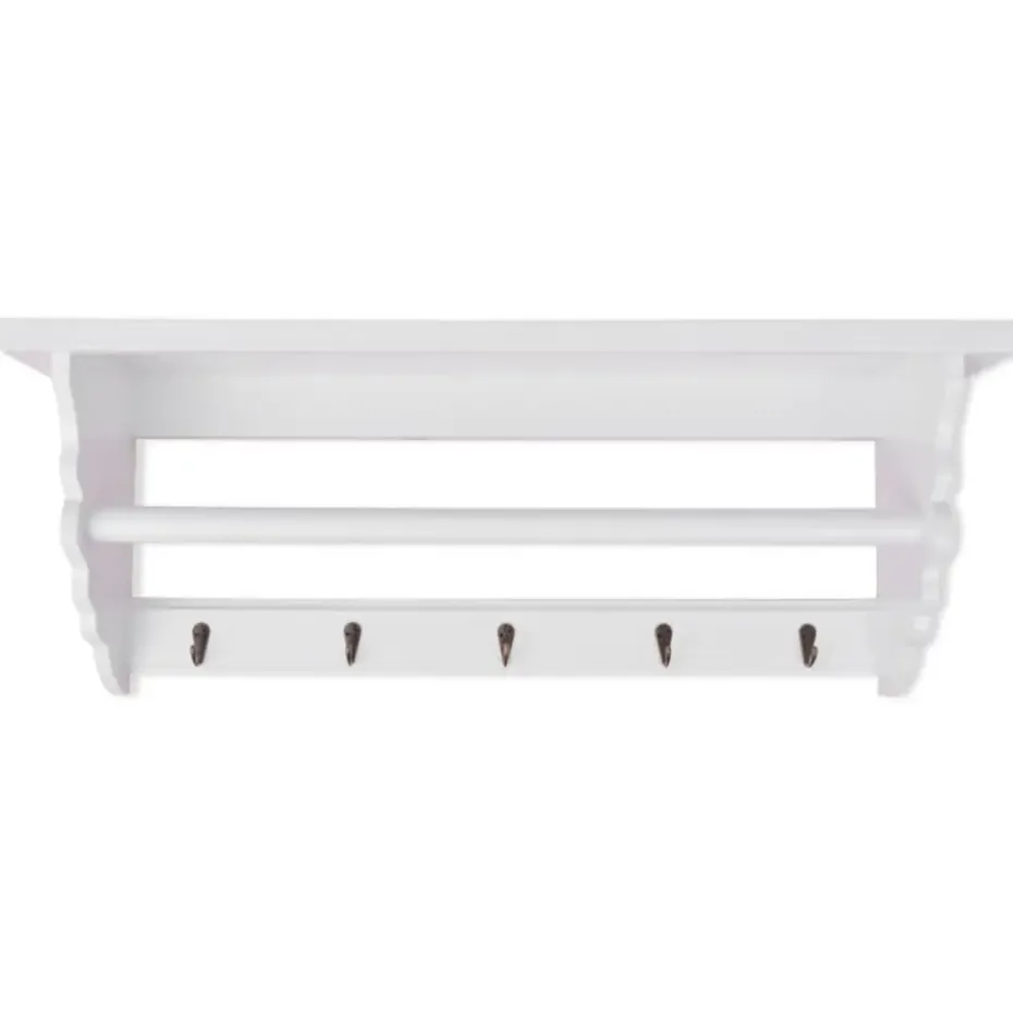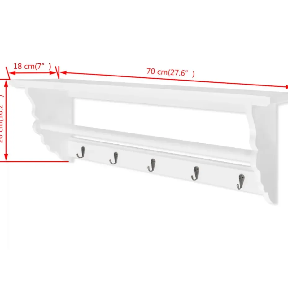 De kapstok heeft een schap dat ideaal is voor het opbergen van spullen zoals trofeeën, boeken, verzamelitems, ornamenten enz. Met zijn 5 haken en 1 houten dwarsbalk biedt het wandschap voldoende ruimte voor het ophangen van je sjaals, dassen, jassen, tassen, hoeden, sleutels enz. Hij is gemaakt van hoogwaardig MDF en dus erg duurzaam.