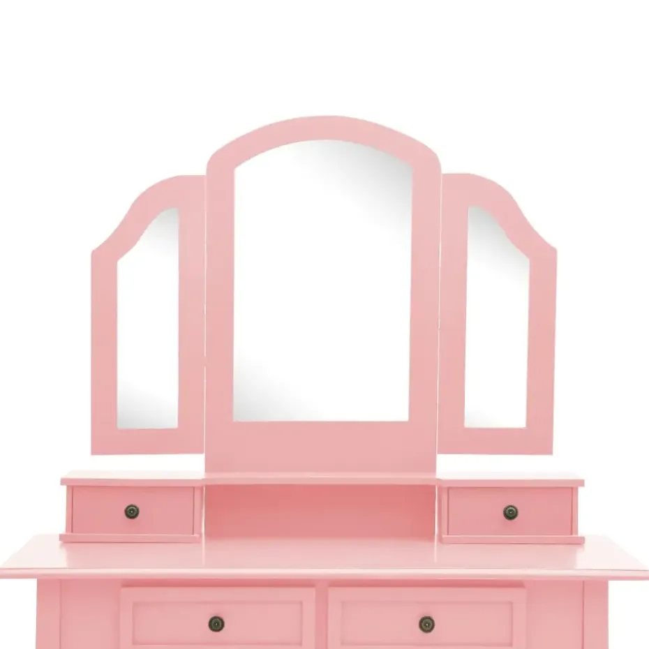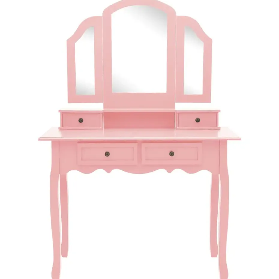 Onze charmante kaptafel met krukje is gemaakt van hoogwaardig paulowniahout. De Victoriaanse stijl en mooie roze afwerking geven een vleugje elegantie en schoonheid aan je slaapkamer, opmaakkamer of inloopkast. Het uitstekende vakmanschap maakt de kaptafelset nog opvallender.