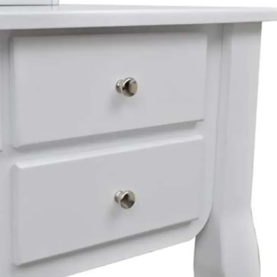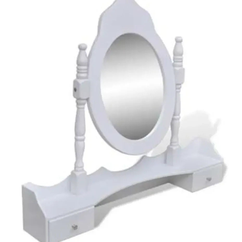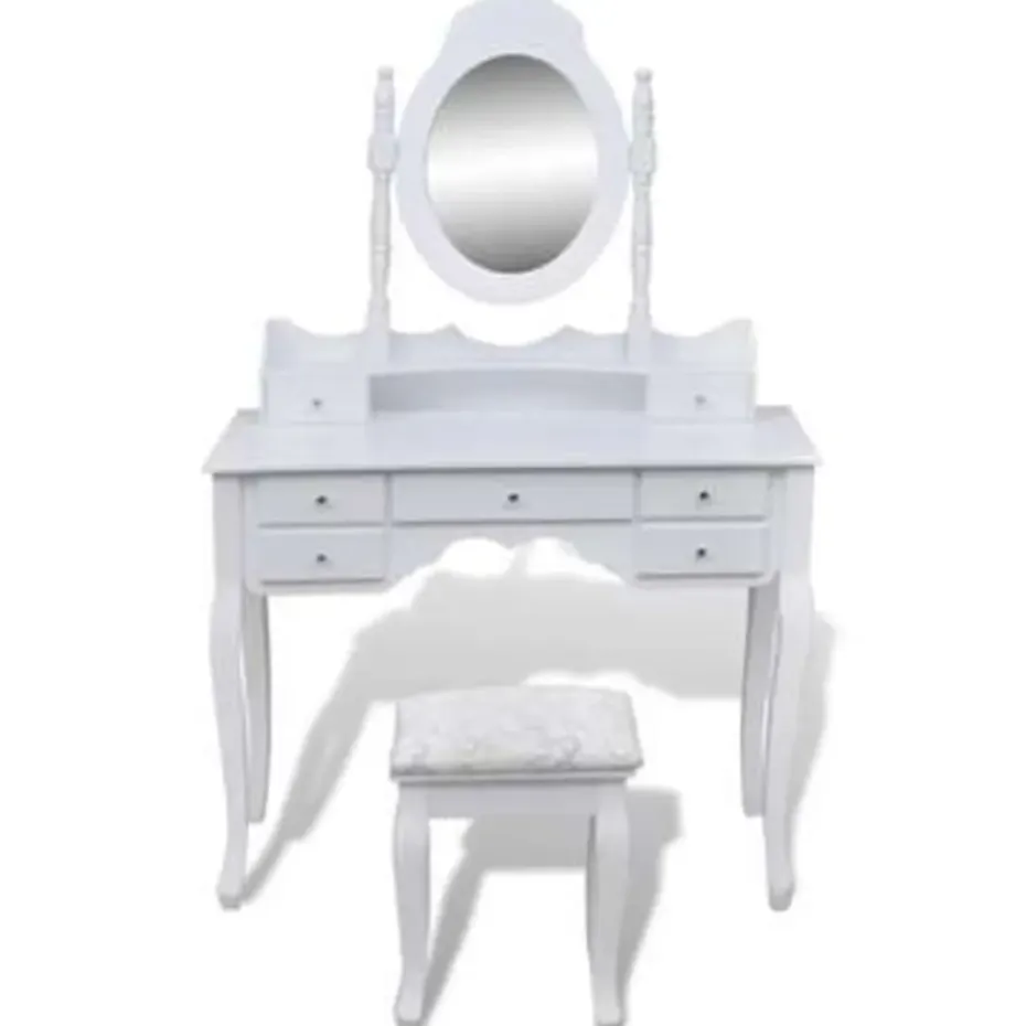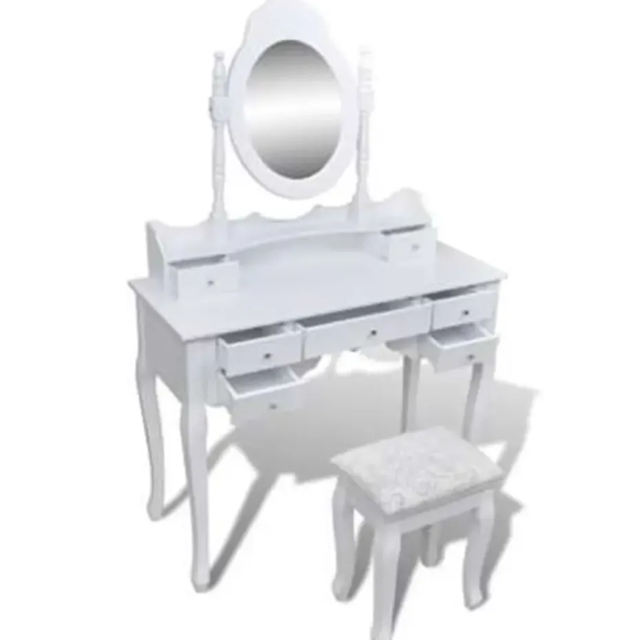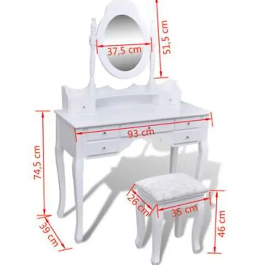 De tafelspiegel is vrijstaand, dus hij kan naar iedere gewenste hoek worden gekanteld. De spiegel en de tafel kunnen afzonderlijk van elkaar worden gebruikt. De 7 mooie lades bieden je extra opslagruimte voor je snuisterijen, make-up en persoonlijke eigendommen. Deze set van een kaptafel en krukje is een echte blikvanger, waar hij ook staat.