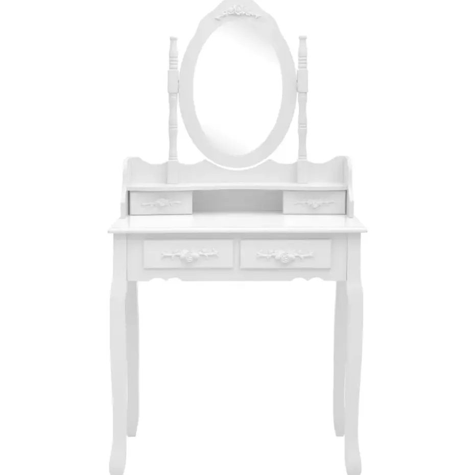 Dit prachtige dressoir is gemaakt van hoogwaardige paulowniahout en heeft een uniek silhouet en vier luxe poten. De 4 lades en 1 open vak bieden de perfecte hoeveelheid ruimte voor het opbergen van make-up en sieraden. Het tafelblad is ook een uitstekende plek om flesjes parfum of andere versieringen op te plaatsen. De meegeleverde kruk heeft een rugloze zitting die bestaat uit een kussen met een bijpassend houten onderstel. Bovendien benadrukt de ingebouwde spiegel het silhouet voor een eigentijdse flair.
