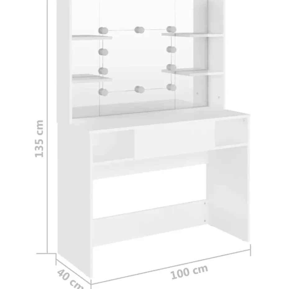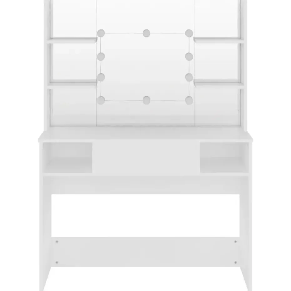 Deze kaptafel, gemaakt van MDF, heeft een strak en beknopt silhouet met een moderne stijl. Hij biedt voldoende ruimte voor make-upartikelen en houdt alles op zijn plaats. Kaptafelspiegel: de prachtige spiegel biedt duidelijk zicht om je make-up aan te brengen en voegt een vleugje elegantie toe aan de kaptafel. De afgebeelde elegante LED-lampen verlichten ook je schoonheid.