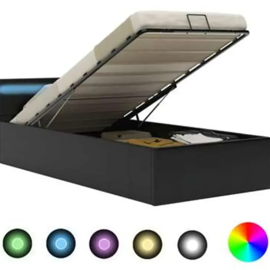 Het gepoedercoat stalen frame en de multiplex lattenbodem dragen bij aan de stevigheid en duurzaamheid van het bed. Dit bed is bekleed met glanzend kunstleer, waardoor het er uitnodigend uitziet en het gemakkelijk te onderhouden is. Dit slaapkamermeubel is geschikt voor een matras van 90 x 200 cm. Dit bed is voorzien van LED-verlichting die eenvoudig kan worden aangepast om een persoonlijke lichtshow te creëren. Je kunt de modi, kleuren en helderheid aanpassen om de sfeer van je binnenruimte te verbeteren. Dit product is eenvoudig te monteren.