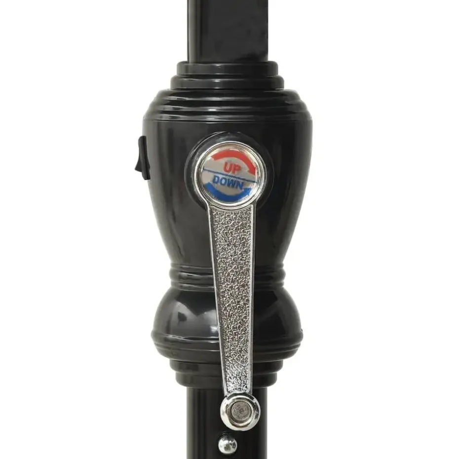 Het parasoldoek is gemaakt van uv-beschermend en anti-vervagend polyester, waardoor het je optimale bescherming tegen de zon biedt. De gepoedercoat stalen paal en baleinen zorgen voor stabiliteit. Dankzij de handslinger en het kantelmechanisme is de parasol inklapbaar en draagbaar. Hij kan worden gemonteerd op een bestaande standaard of in het midden van de tafel als hij een parasolgat heeft. De geïntegreerde LED-verlichting, gevoed door het zonnepaneel, zorgt voor een knusse, romantische sfeer.