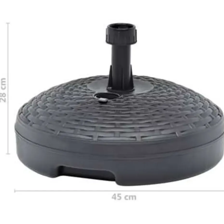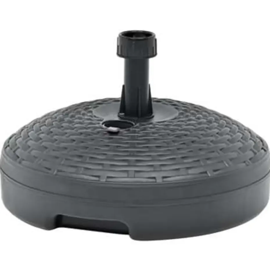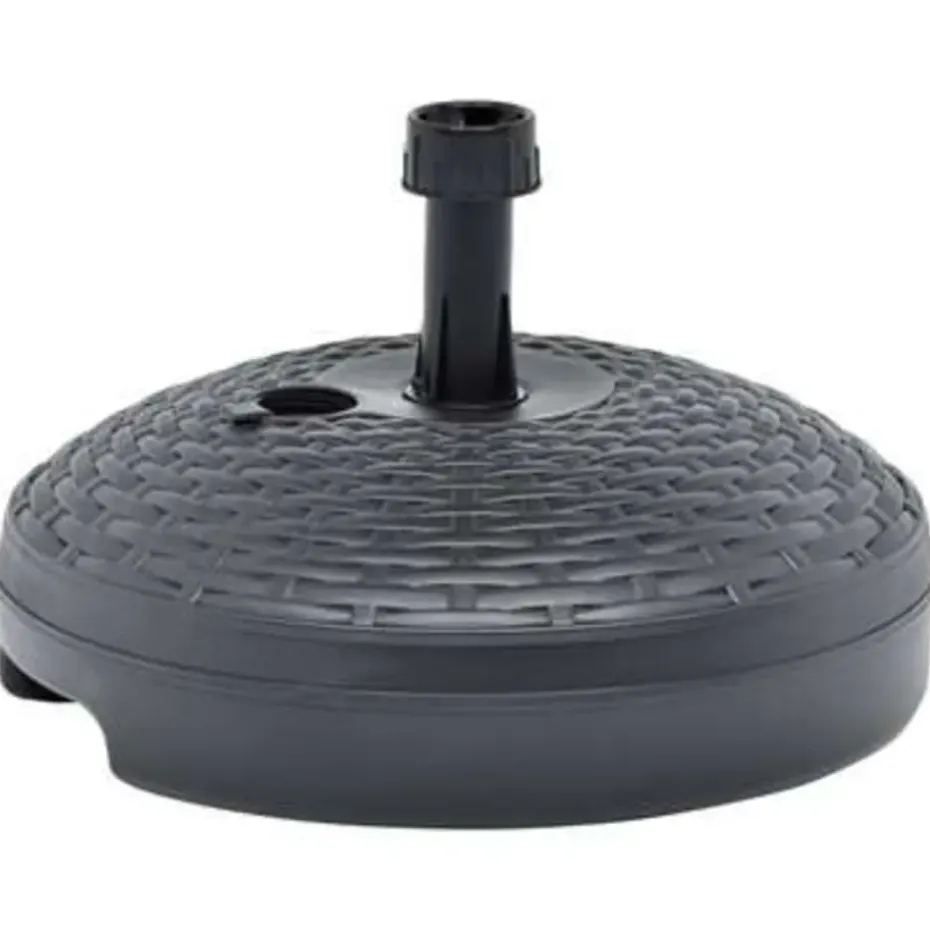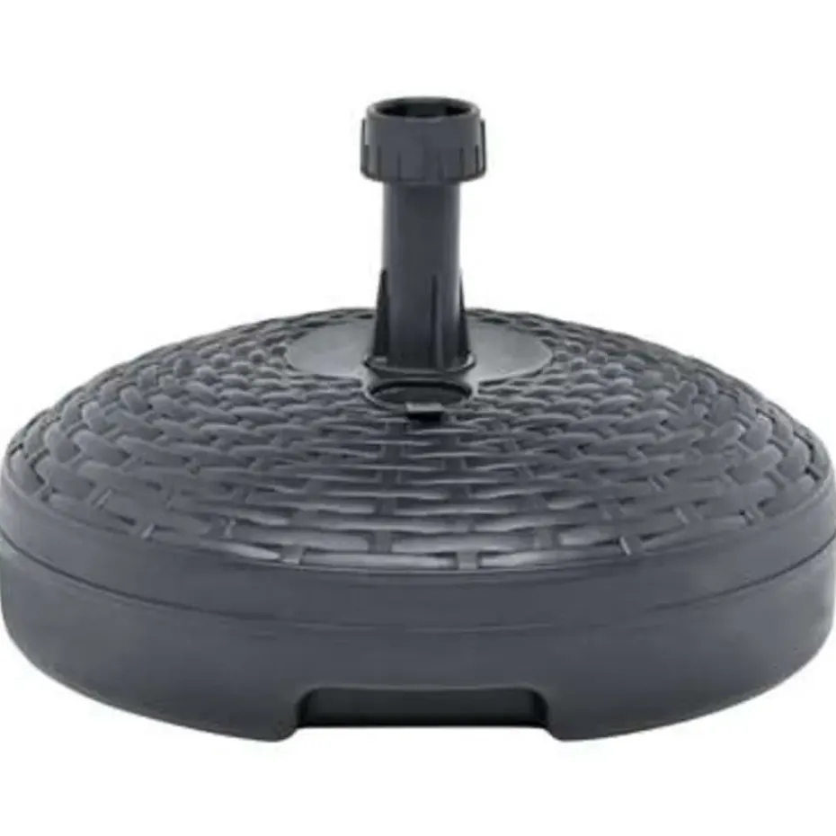 Deze parasolvoet met rattan patroon is ontworpen om te worden gevuld met water of zand. Hij dient als een stevige en stabiele basis voor je parasol.