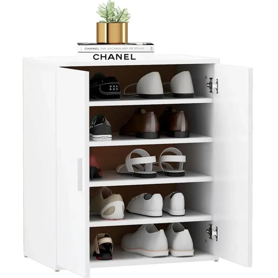 Deze halkast is gemaakt van bewerkt hout en is buitengewoon duurzaam en stevig. De schoenenkast heeft 5 schappen, die voldoende ruimte bieden om je schoenen goed geordend te houden. Dankzij de 2 deuren beschermt de schoenenopberger je schoenen tegen stof en houdt hij ze uit het zicht. De kast is bovendien naar eigen behoeften aan de muur of grond te monteren.