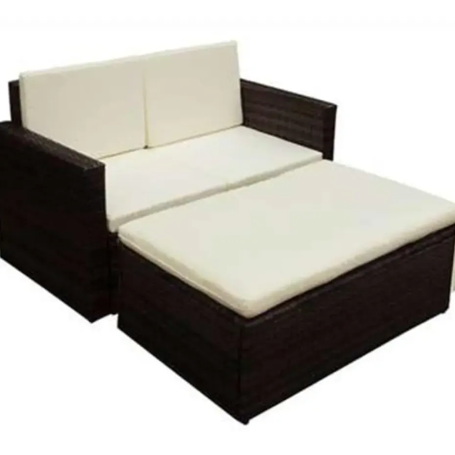 De levering bestaat uit 1 tweezitsbank, 1 hocker en 5 kussens. Opmerking: wij raden aan om de set af te dekken wanneer het regent, sneeuwt of vriest.