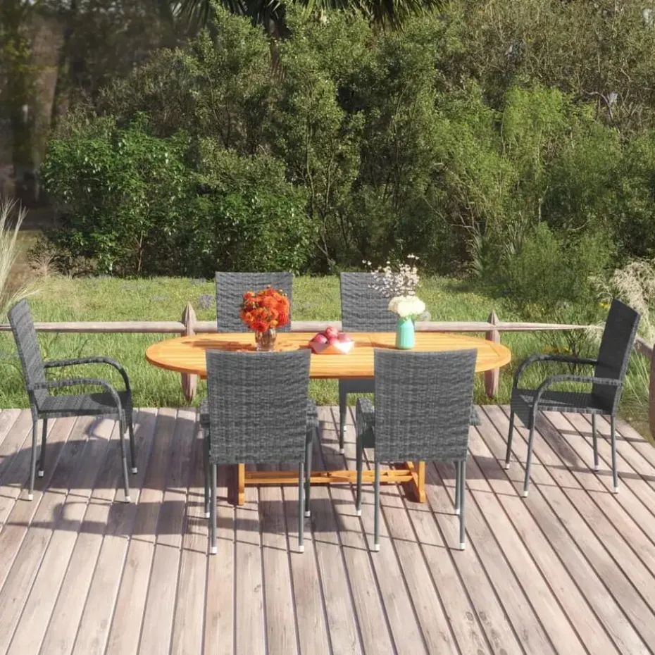 De buitentafel is gemaakt van massief acaciahout, waardoor hij stevig en stabiel is. Het geoliede oppervlak maakt het meubel eenvoudig schoon te maken met een vochtige doek. De eetstoelen hebben een stalen frame bedekt met weerbestendig PE-rattan, waardoor ze stevig en eenvoudig te reinigen zijn. Deze tuinstoelen kunnen gestapeld worden om ruimte te besparen wanneer ze niet gebruikt worden.