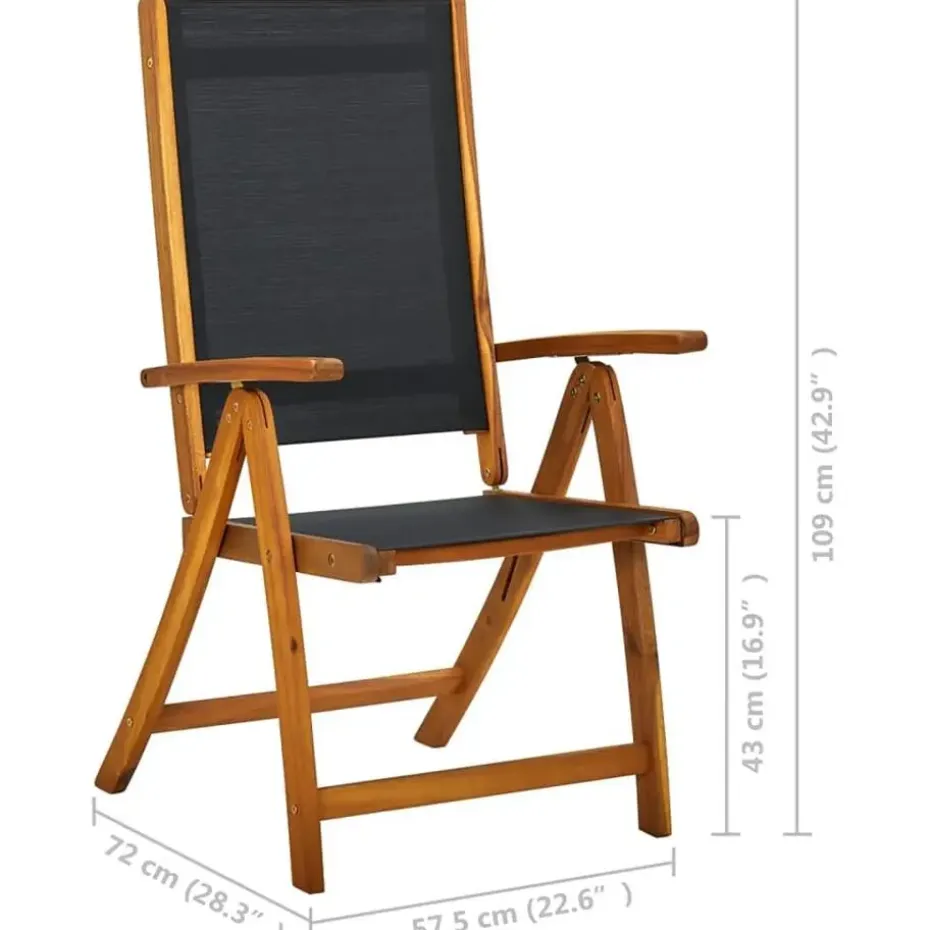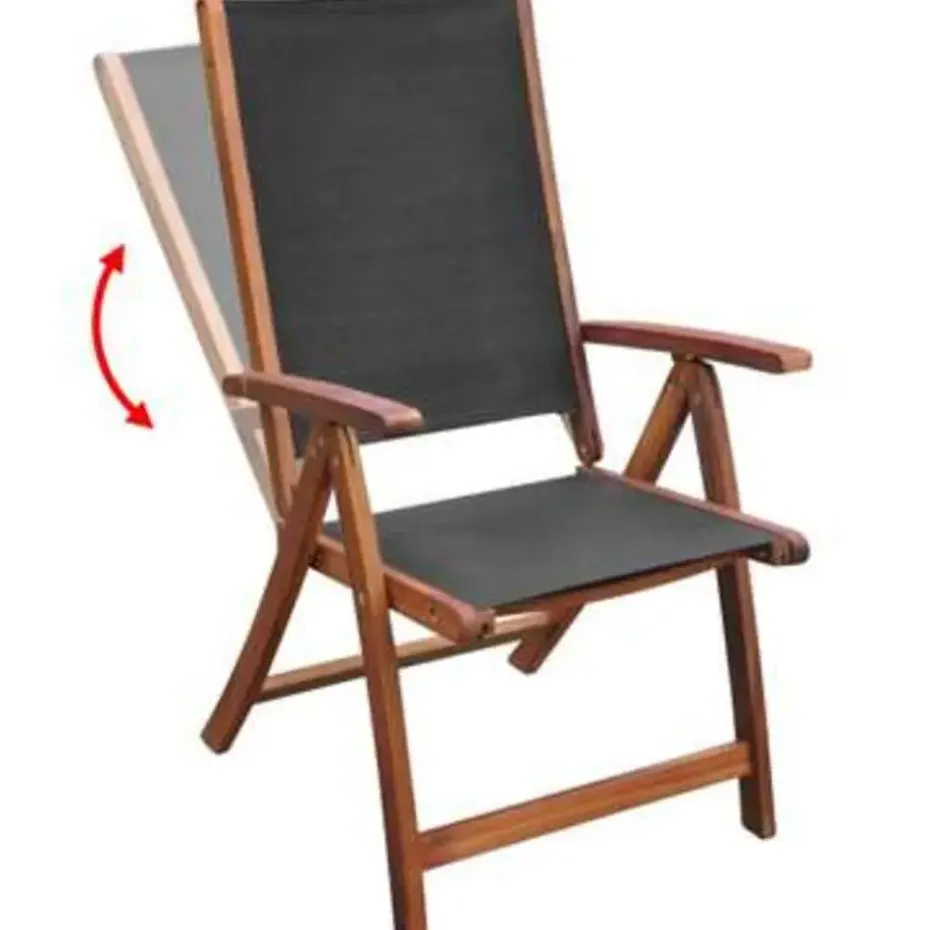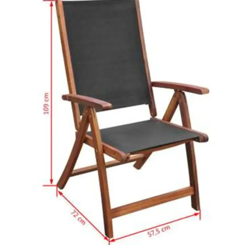 Deze houten tuinmeubelset is het middelpunt van je tuin en/of terras. De eettafel is gemaakt van hoogwaardig acaciahout, een tropisch hardhout, dat weerbestendig is en een lange levensduur heeft. De donkere olieafwerking is eenvoudig schoon te maken met een vochtige doek. De stoelen kunnen ingesteld worden op 5 verschillende posities en hebben een soepele, zachte, weerbestendige textileen afwerking. Met de 5 zitposities kan je altijd de meest comfortabele positie vinden. De tafel en stoelen kunnen ingeklapt worden, zo bespaar je ruimte wanneer het tijd is om de set op te bergen.