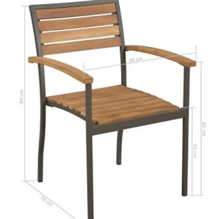 De tafel en stoelen zijn gemaakt van massief acaciahout met een olieafwerking en hebben een lattenpatroon. De stalen frames maken ze stevig en stabiel en geven ze een industriële uitstraling. De stoelen kunnen worden gestapeld om ruimte te besparen wanneer ze niet worden gebruikt.