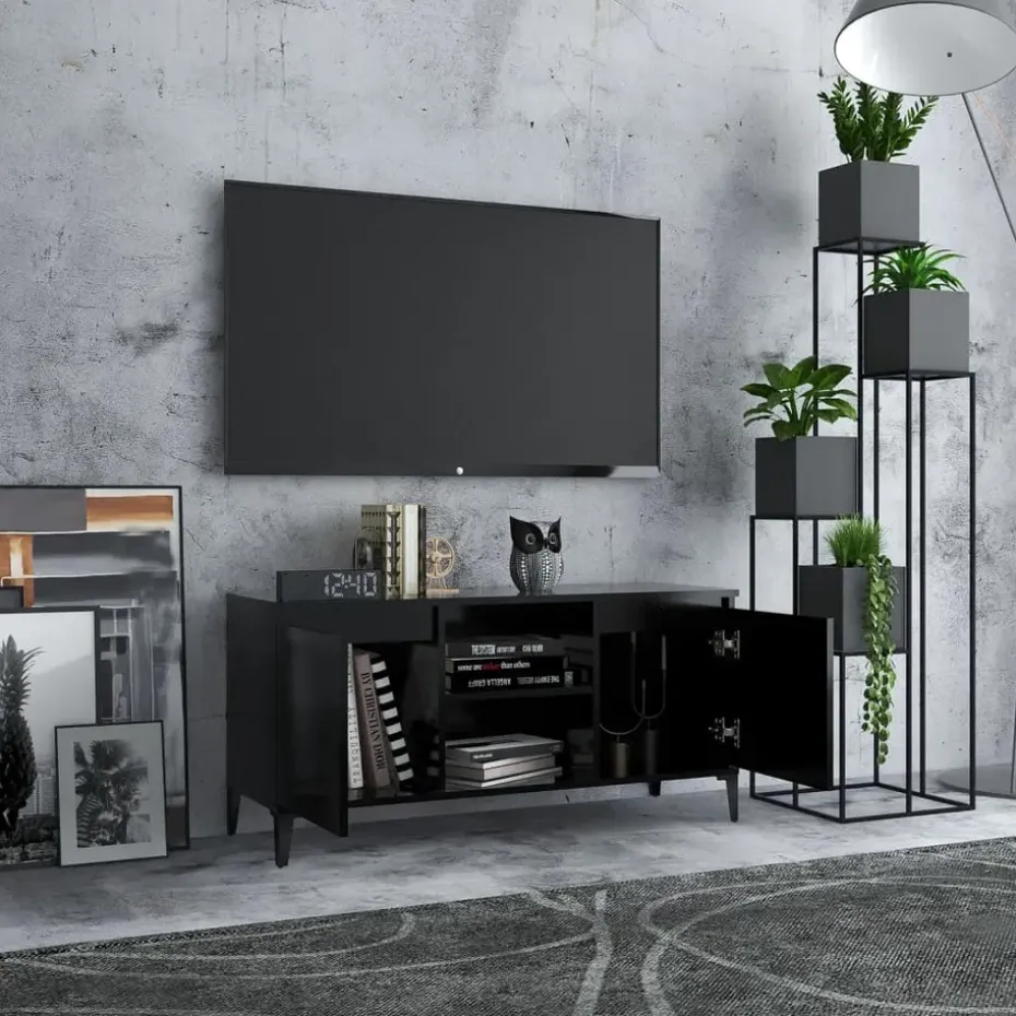 Dit televisiemeubel met 4 metalen poten is stabiel en stevig. Het dressoir is ontworpen met 2 schappen en 2 vakken en biedt voldoende ruimte om tijdschriften, boeken, dvd’s en multimedia-apparaten overzichtelijk en binnen handbereik op te bergen. Bovendien is het meubel gemakkelijk schoon te maken met een vochtige doek.