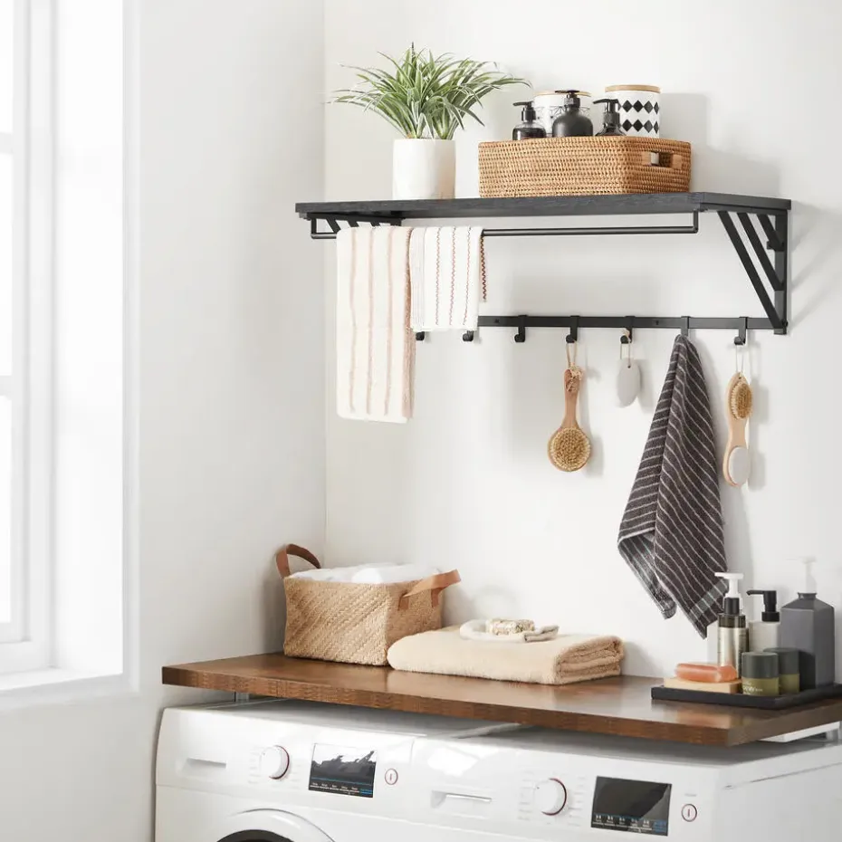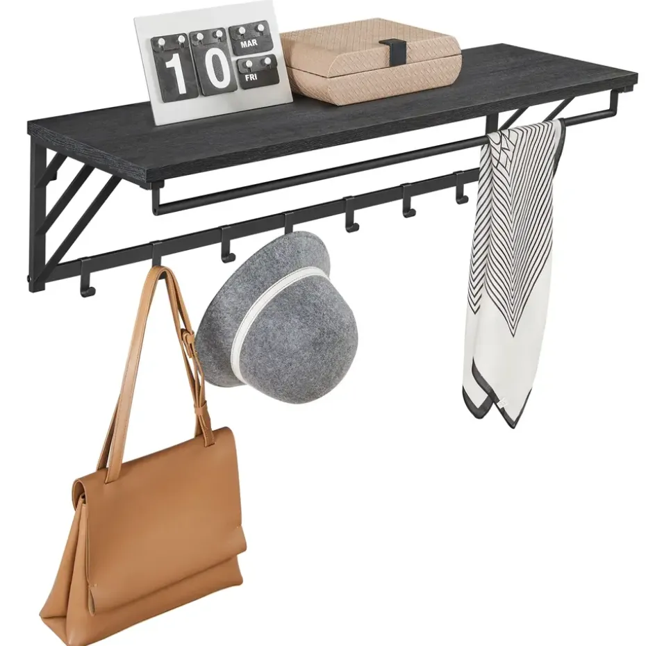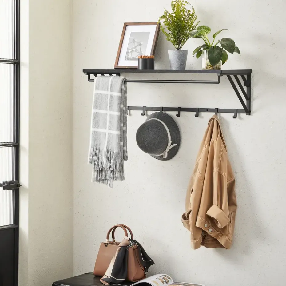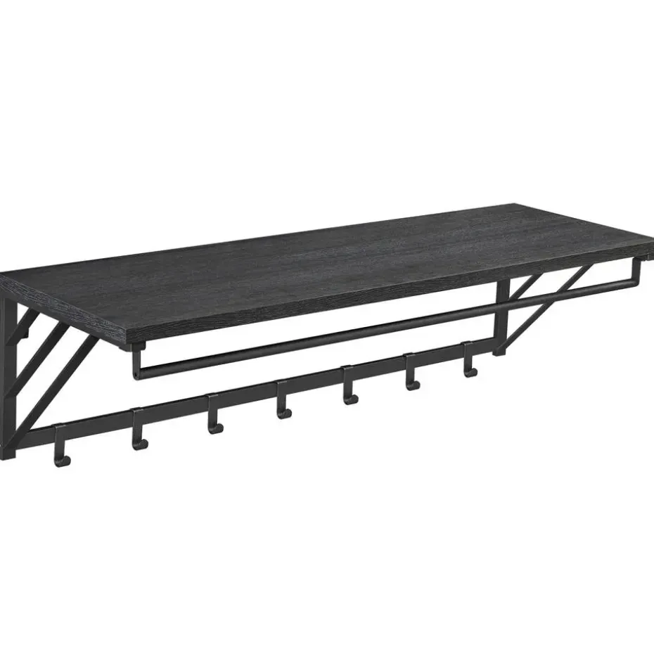 Deze trendy kapstok van ACAZA combineert verschillende ophang- en opbergmogelijkheden. Op de houten plank kan je wat leuke plantjes of vaasjes plaatsen, maar je kan er evengoed jouw sjaals, mutsen of sleutels op kwijt. De kapstok heeft 7 stevige haken die je kan gebruiken voor jouw jassen of andere kledingstukken. Aan de extra bar kan je sjaals hangen, maar ook kledinghangers. De kapstok is volledig uitgevoerd in het zwart toets waardoor ze een echte eyecatcher zal zijn in uw hal, badkamer of woonkamer.