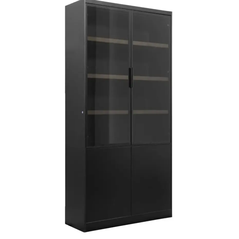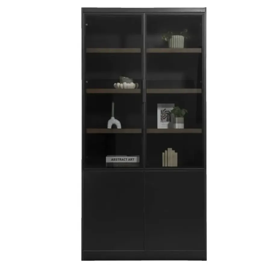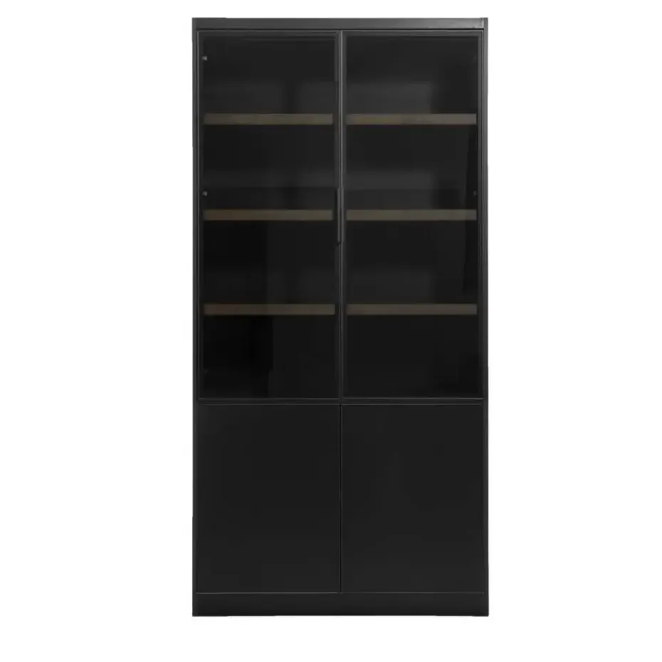 Vitrinekast Virgil is er in verschillende maten en kleuren. Deze variant is 220x110x40 cm (hxbxd) en is zwart. De kast is gemaakt van MDF en heeft 2 softclose deuren. Dat betekent dat de deur zacht dicht valt. Door de combinatie van kleur en materiaal past deze wandkast goed in een modern en stoer interieur.
