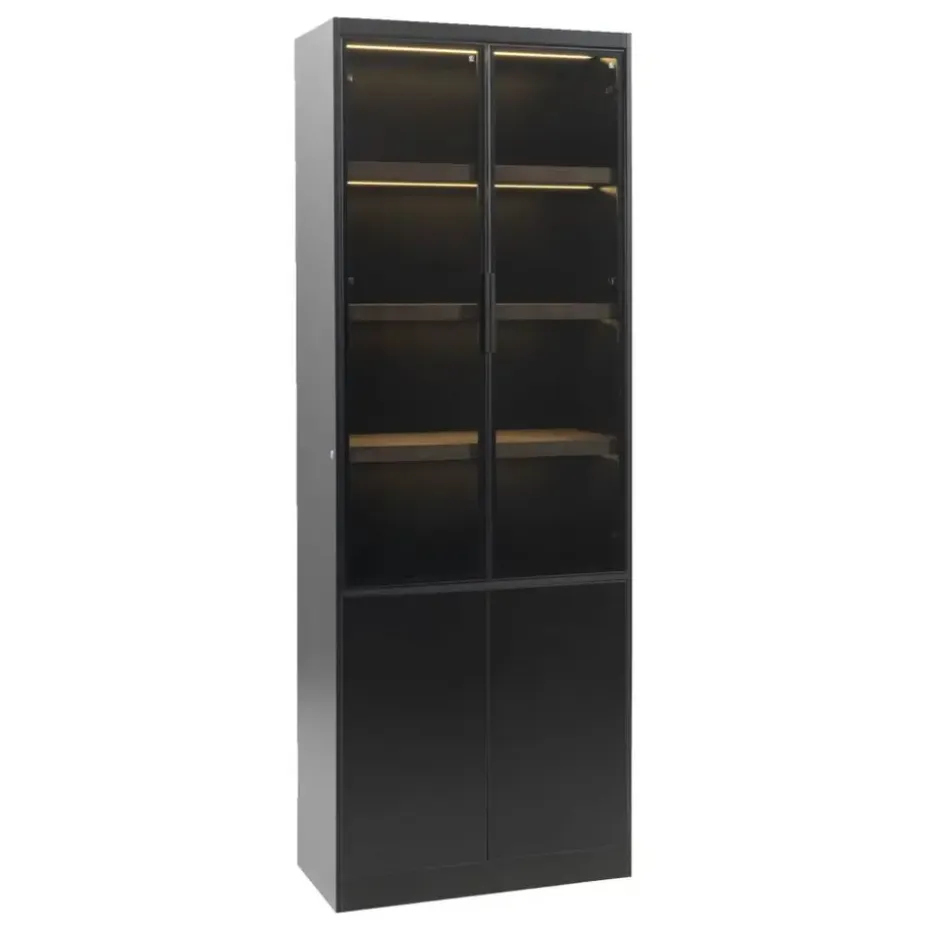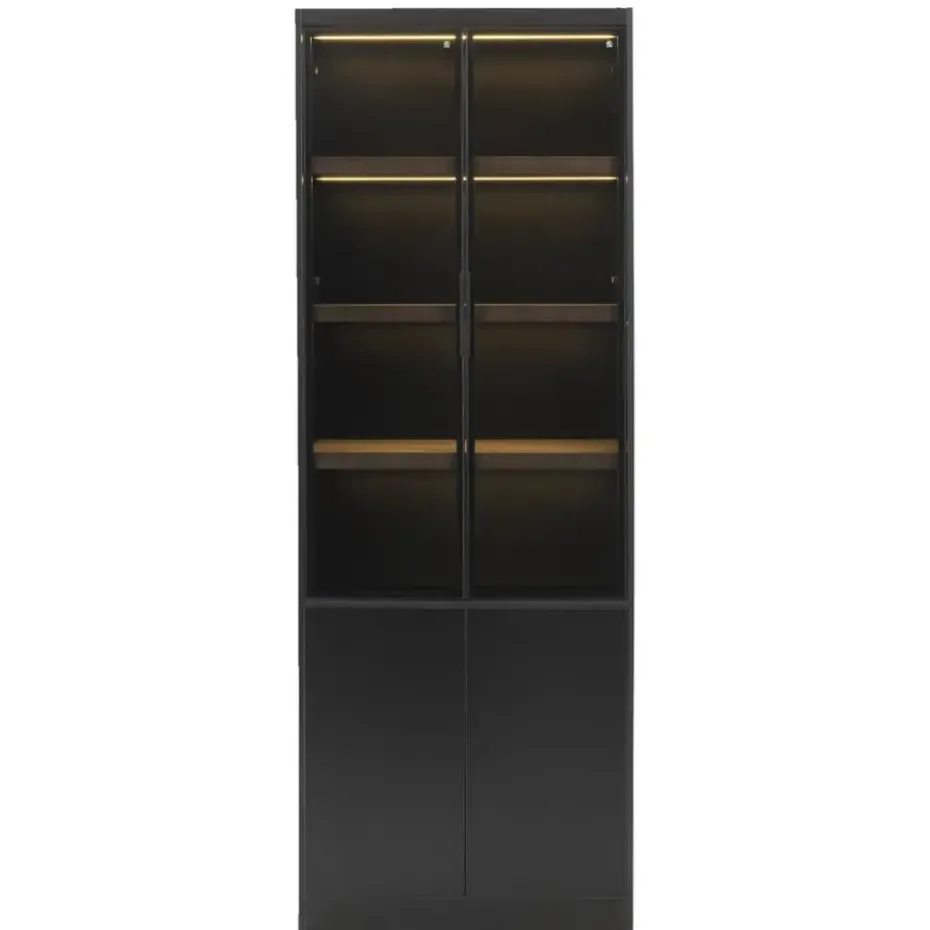 Vitrinekast Virgil is er in verschillende maten en kleuren. Deze variant is 220x80x40 cm (hxbxd) en is zwart. De kast is gemaakt van MDF en heeft 2 softclose deuren. Dat betekent dat de deur zacht dicht valt. Door de combinatie van kleur en materiaal past deze wandkast goed in een modern en stoer interieur.
