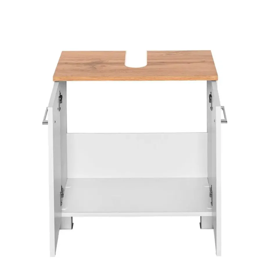 Deze wastafelonderkast Pares is 60cm breed en is gemaakt van gemelamineerde spaanplaat in wit. Het meubel is uitgerust met twee lades, voorzien van grijze handgrepen. Binnenin vind je voldoende kastruimte voor verzorgingsproducten, accessoires en enkele handdoeken. Het bovenblad kenmerkt zich door het warme wotan eikdecor. De wastafel zelf is niet inbegrepen, de uitsnijding voor de sifon wel. De vier meegeleverde meubelpootjes geven je de mogelijkheid om de kast ook op de vloer te installeren. Ontdek de rest van de Pares-meubelen in deze uitvoering en andere kleurencombinaties op onze website!