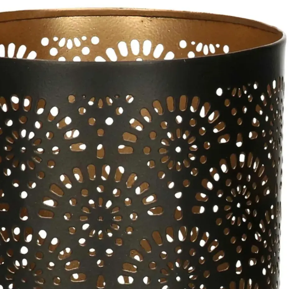 Windlichten set van 2x stuks met motief. Deze theelichthouders zijn aan de buitenzijde zwart en hebben aan de binnenzijde een metallic koperen afwerking. De houders hebben twee verschillende formaten, het kleine model heeft een diameter van circa 8 cm en een hoogte van circa 10 cm. Het grotere model heeft een diameter van circa 10 cm en een hoogte van circa 15 cm.