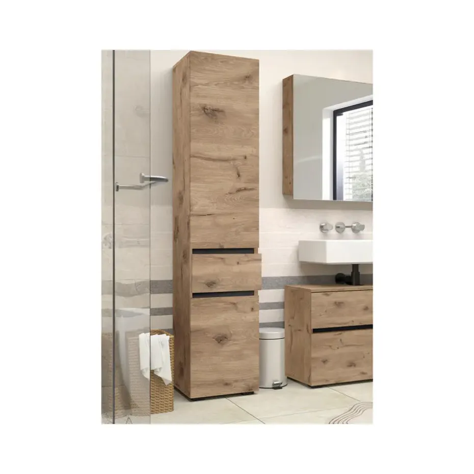 Deze hoge kast is een echt organisatietalent en helpt je om je spullen op orde te houden. Je kunt de openingsrichting naar wens kiezen, want de deur kan zowel rechts als links scharnieren. De lades kunnen volledig worden uitgeschoven, wat extra opbergmogelijkheden biedt. De verstelbare planken bieden maximale flexibiliteit. Zo kun je zelf bepalen hoe hoog je de afzonderlijke vakken wilt hebben.