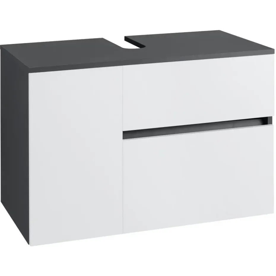 Het badmeubel met matte fronten geeft je badkamer een modern tintje. Achter de deur en klep met push-open functie zit handige opbergruimte voor verschillende gebruiksvoorwerpen. Het badmeubel heeft ook een ruime lade.