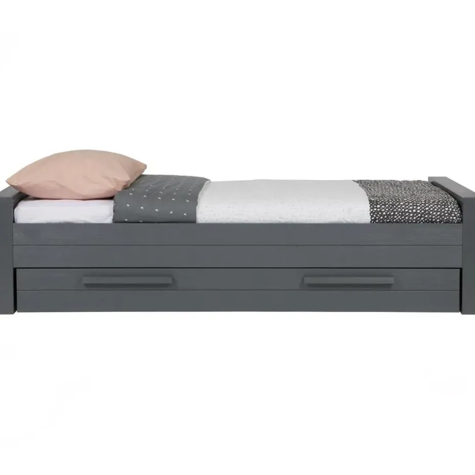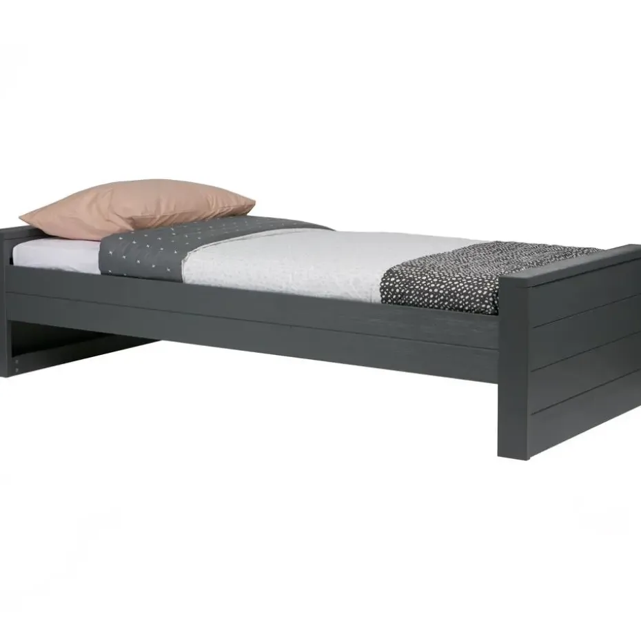 WOOOD Dennis Bed incl. matras/bedlade 219x53x95 (bxhxd) is een moderne en stoere bed voor een kinder- en tienerslaapkamer. Het Dennis bed incl. matras/bedlade is voor één-persoon en komt uit de collectie van het Nederlandse merk WOOOD. Het bed en matras/bedlade zijn gemaakt van grenenhout met een staal grijze finish en heeft een geborstelde afwerking waardoor het bed een éxtra robuuste en stoere uitstraling krijgt. De matras/bedlade wordt standaard geleverd als opberglade, maar wanneer er een lattenbodem met lint (90×200) en een matras (90x190x12) wordt toegevoegd kan de lade ook worden gebruikt als logeerbed. De Dennis bedbank wordt exclusief matras (90×200) en inclusief lattenbodem geleverd.