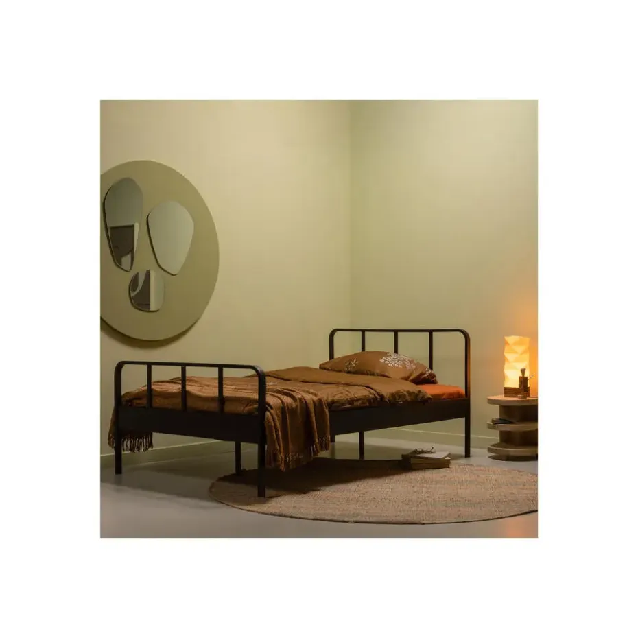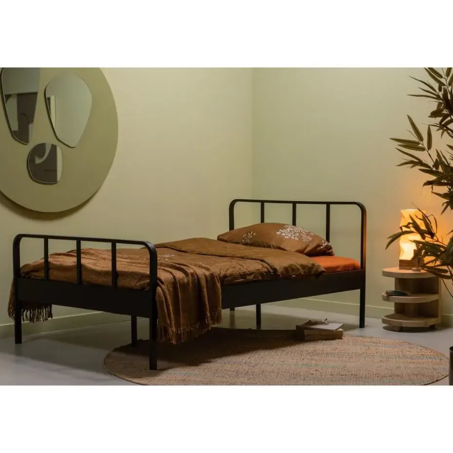 Het Mees bed, uit de WOOOD-collectie, wordt gekenmerkt door het luchtige spijlenframe en de matzwarte afwerking exclusief matras. Het bed is gemaakt van gepoedercoat metaal en heeft een zeer sterke constructie. Het metalen bed biedt ruimte voor een matrasmaat van 120×200 cm. Van lattenbodem tot bedrand is 14 cm hoog.