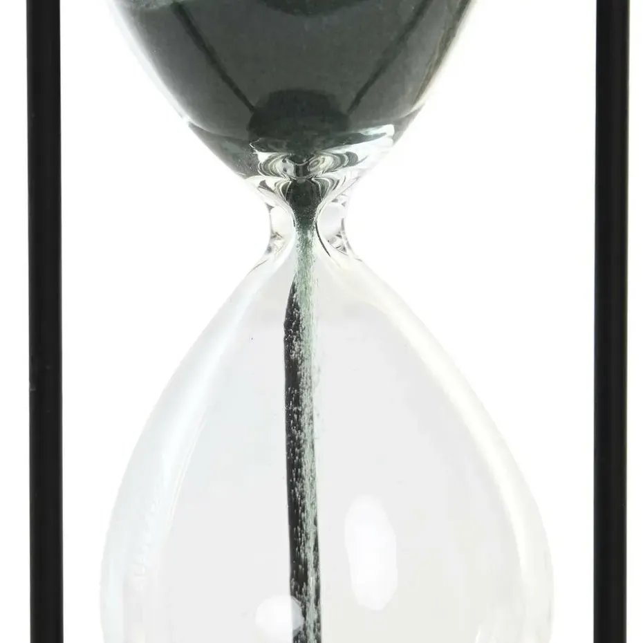 Zandloper cilinder Timer in de kleur zwart en zwart zand . Dit artikel kan ter decoratie of tijdsmeting gebruikt worden. Eenheid: 1,5 minuten. Afmetingen: D10,5 x H18,5 cm. Materiaal: glas.