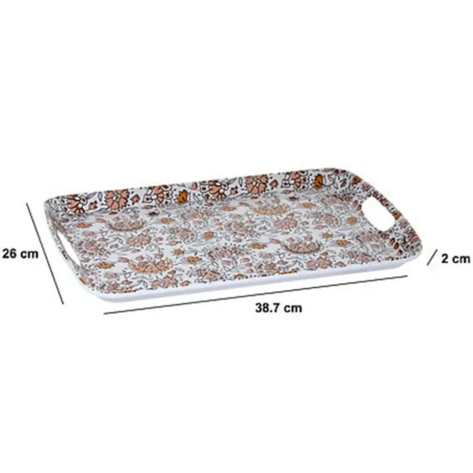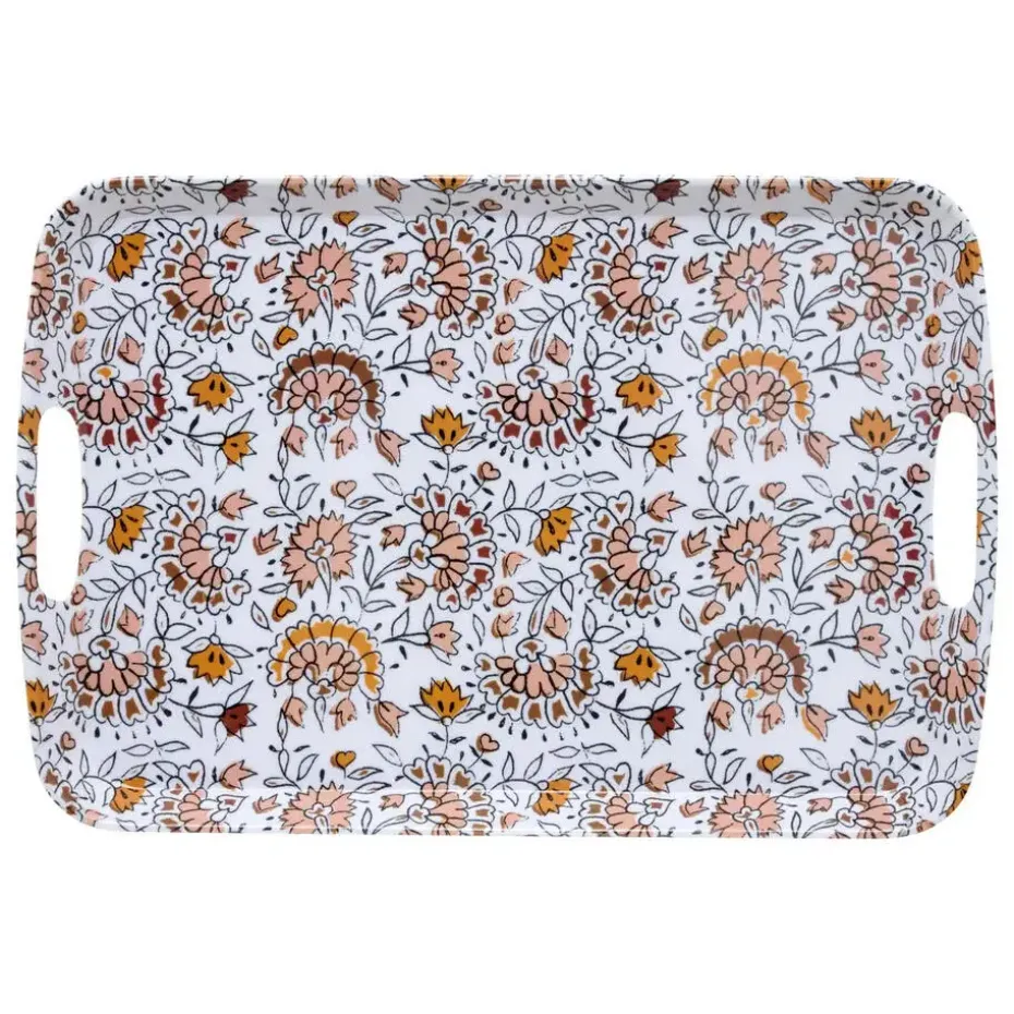 Design serveer dienblad met opstaande rand van 2 cm voor glazen en kopjes. Materiaal: melamine. Print: Flowers. Afmetingen: 39 x 26 x 2 cm. Gebruik het dienblad voor het serveren van koffie, thee, gebakjes, ontbijt, noem maar op. Deze karaktervolle, maar vooral ook handige ruime serveertray is overal voor te gebruiken. Kleur: wit als basis kleur.