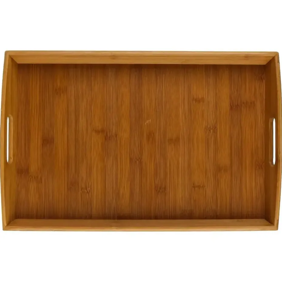 Dienblad/serveerblad rechthoekig van bamboe hout. Dit serveerblad beschikt over handige handvaten en heeft een natuurlijke uitstraling. Makkelijk schoon te maken met een vochtige doek. Afmeting: 45 x 29 x 5,3 cm. Materiaal: bamboe.