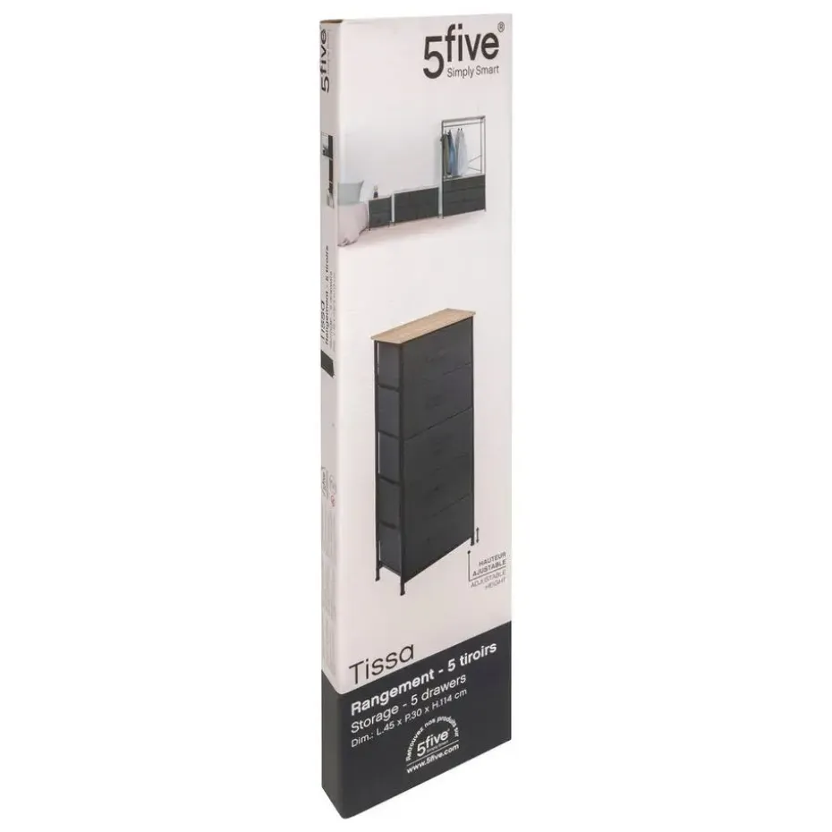 Badkamerkastje/opbergkastje/mandjes kastje. Een handig bijzet kastje met 5x opberg manden gemaakt van non-woven kunststof in de kleur donkergrijs voor in badkamer, hal of slaapkamer. Ideaal om washandjes, tandpasta, zeepjes, medicijnen, speelgoed of cosmetica in op te bergen. Afmeting: ca. 45 x 30 x 114 cm. Materiaal: metaal/mdf hout/polyester. De mandjes zijn in 1 formaat. Merk: 5Five. Zelf monteren.