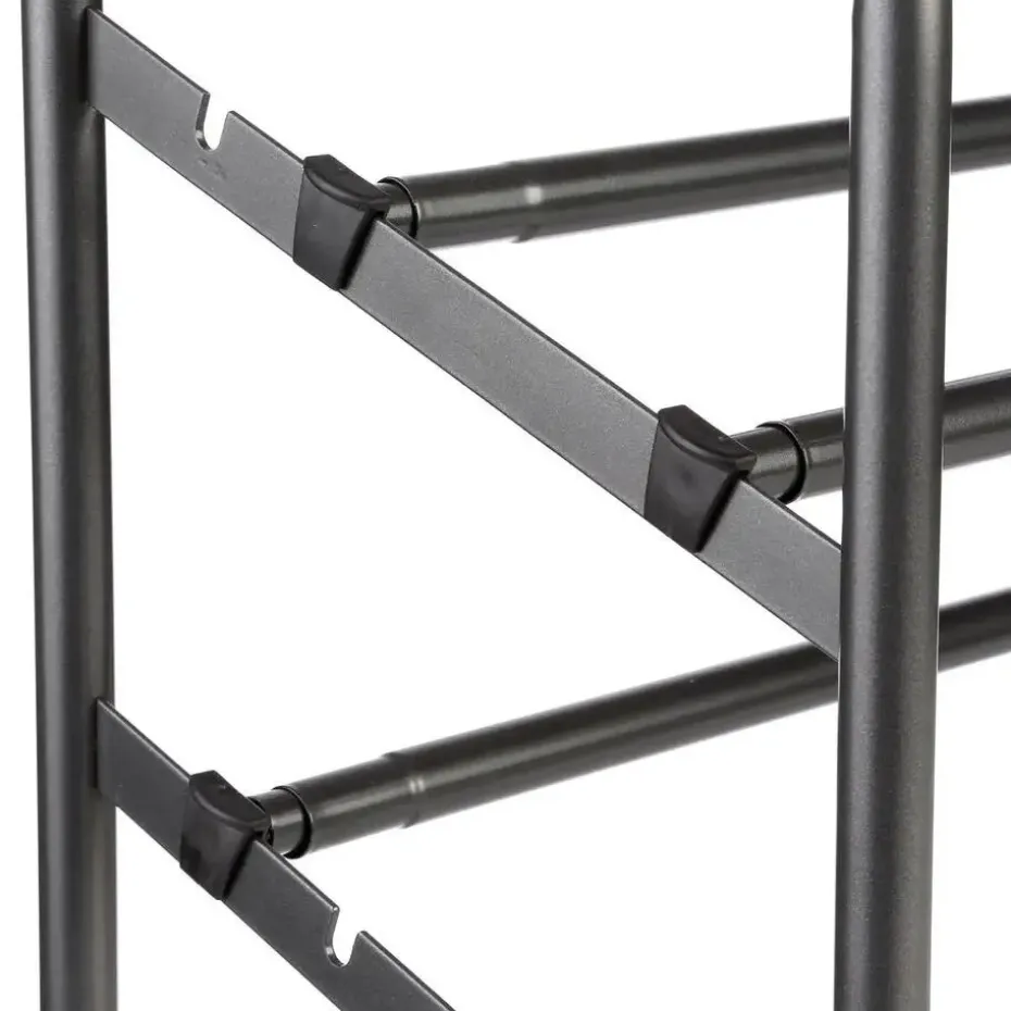 Schoenenrek/schoenenkast uitschuifbaar in het zwart, met afmetingen 61 x 39 cm, gemaakt van metaal. Dit schoenenrek heeft 2 verdiepingen met 2 stangen welke u op 2 afstanden kunt plaatsen (voor grote en kleine schoenen) en heeft ruimte voor 6 tot 10 paar schoenen. U dient het rek zelf in elkaar te zetten, bevestigingsmateriaal inbegrepen. Afmeting: ca. 61 x 23,5 x 39 cm, uitschuifbaar tot 115 cm. Materiaal: metaal met kunststof voetjes.