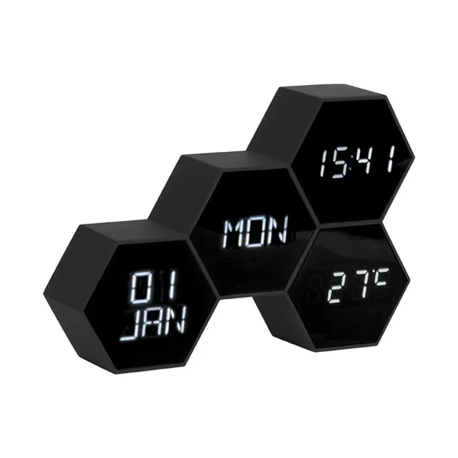 Deze moderne digitale wekker van Karlsson met usb-aansluiting helpt je natuurlijk om op tijd op te staanDeze moderne digitale wekker van Karlsson met usb-aansluiting helpt je natuurlijk om op tijd op te staan. Maar zeshoekige design wekker Six in the mix kan meer! Je leest de dag, datum en temperatuur eenvoudig af én hij reageert bij aanraking of geluid. Handig! Dankzij dit zwarte pareltje stap jij dagelijks met je goede been uit bed.Karlsson klokken en wekkers zijn wereldwijd favoriet. Een kleine greep uit het aanbod: de Karlsson block wekker, Karlsson wekker square, óf een wekker van hout of koper.