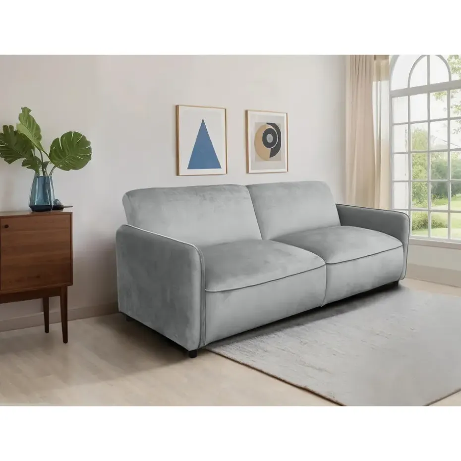 De elegante slaapbank met drie zitplaatsen, bekleed met luxueuze zachte fluweelstof, is perfect voor elke woonkamer, logeerkamer of thuiskantoor. Het voegt een vleugje verfijning toe aan je interieur. Deze handmatig verstelbare slaapbank verandert moeiteloos in een extra slaapplaats, ideaal voor het ontvangen van logés. Je kunt eenvoudig je favoriete positie instellen in slechts een paar stappen. De matras, met een afmeting van ongeveer 110 × 190 cm, bevat steunpoten die slim in de rugleuning zijn verborgen voor extra stabiliteit. Elke zitplaats kan een maximale belasting van 135 kilogram dragen. In gemonteerde toestand zijn de afmetingen van de slaapbank ongeveer 209 × 91 × 80 cm. Het product is FSC®-gecertificeerd.