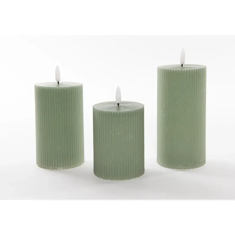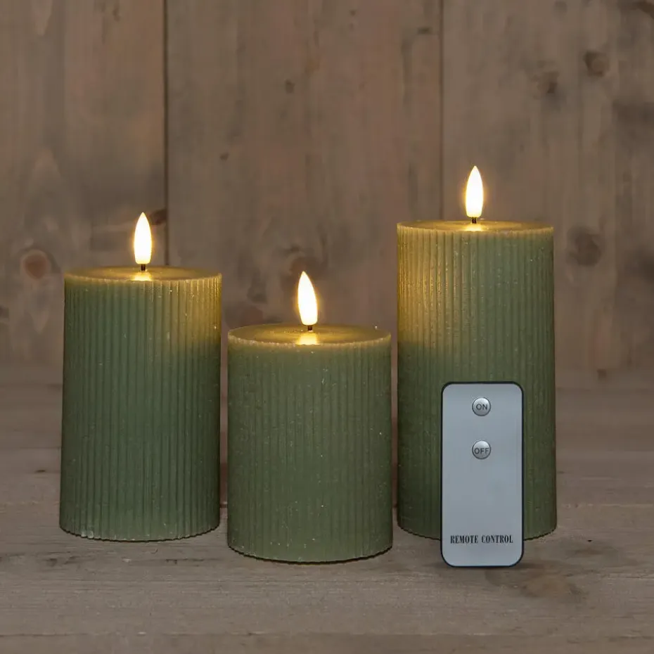Deze LED kaarsen/stompkaarsen set bevat 3 stuks kaarsen in een prachtige kleur: jade groen en hebben een ribbel effect. De kaarsen zijn gemaakt van hoogwaardig materiaal en geven een mooi, warm licht. Ze zijn veilig om te gebruiken omdat ze geen hitte of rook produceren. De set wordt geleverd met 3 verschillende groottes. waardoor je verschillende decoratieve opties hebt. Geniet van de sfeer die deze LED kaarsen geven. Formaat kaarsen: 7,5 x 10, 7,5 x 12,5 en 7,5 x 15 cm. Voeding per kaars: 3 AAA batterij (niet inbegrepen). – Inclusief afstandsbediening- warm wit licht- mooie ribbel afwerking