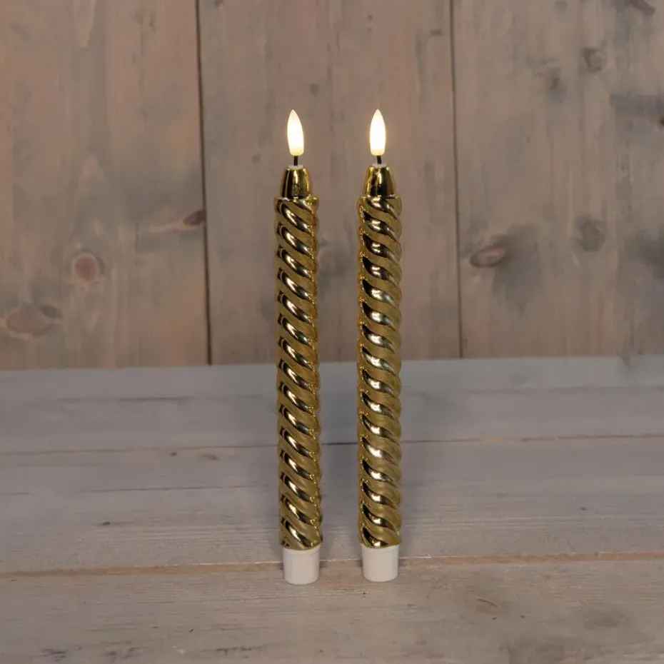 LED dinerkaarsen 2x stuks van 25 cm lang. Voeg een vleugje luxe toe aan je diner met deze set van 2x stuks dinerkaarsen in de kleur goud met een swirl afwerking. Met een hoogte van 25 cm en LED bewegende vlam, zorg je voor een warme en elegante sfeer. Met timer functie om de kaarsen automatisch in- en uit te schakelen. 2 AA batterijen per kaars worden niet meegeleverd. Laat de betovering van kaarslicht zonder zorgen om open vuur je tafel verfraaien met deze stijlvolle LED dinerkaarsen.
