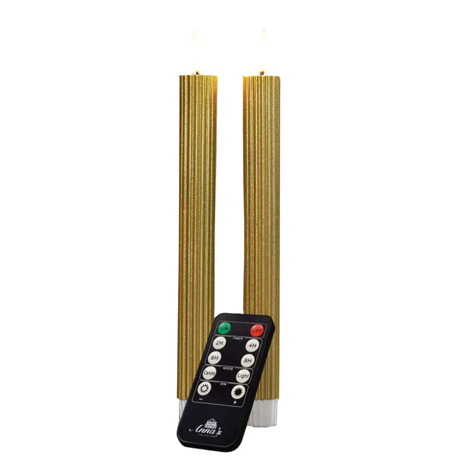 Set van 2 gouden LED dinerkaarsen met ribbelstructuur van Anna’s Collection – 23 cm hoog*Deze set bevat 2 LED dinerkaarsen in een elegante gouden kleur met een rustieke ribbelafwerking. De kaarsen zijn circa 23 cm hoog en stralen een warme, sfeervolle gloed uit zonder open vlam. Ze werken op 2 AA batterijen per kaars (niet inbegrepen) en worden geleverd met een afstandsbediening waarmee je de timer- en dimmerfuncties kunt bedienen. Veilig en stijlvol, perfect voor elke feestelijke gelegenheid.