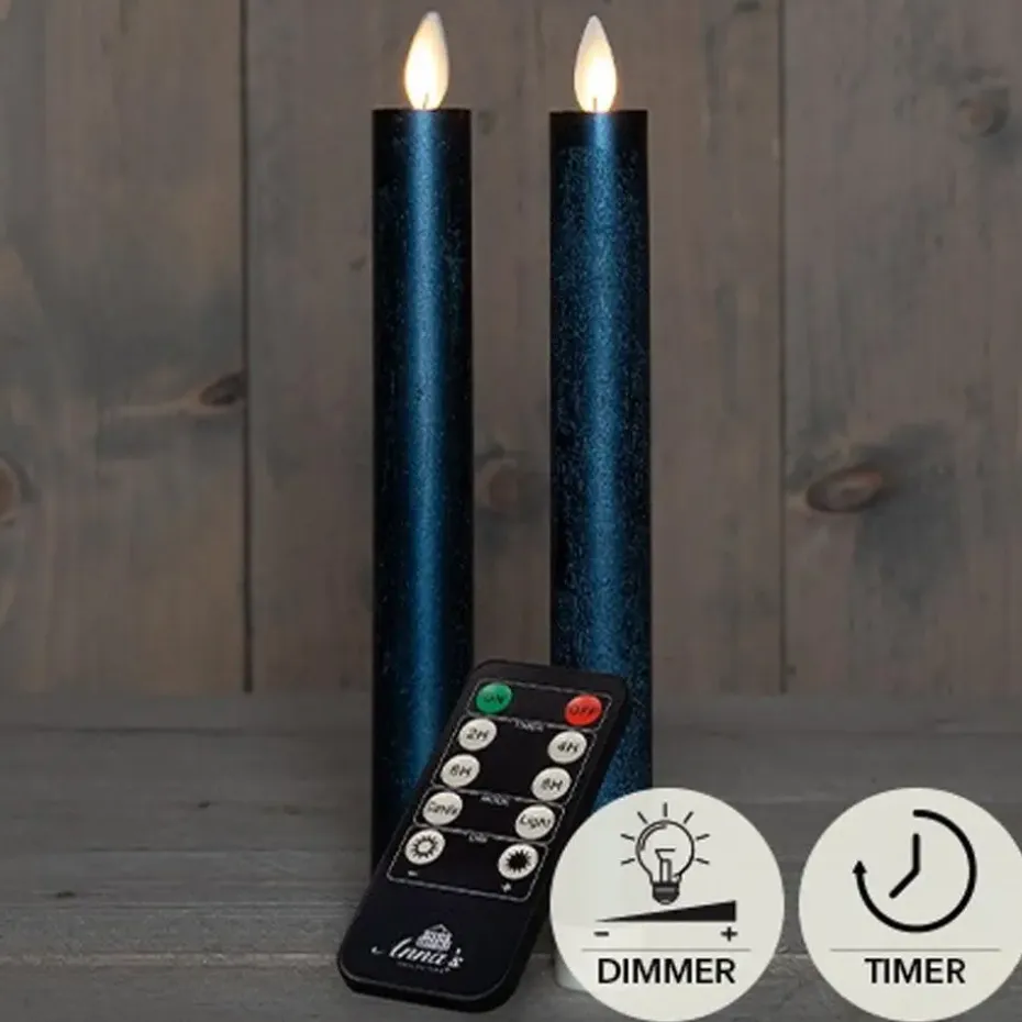 LED dinerkaarsen van 23 cm. Voeg een gezellig sfeer toe aan je diner met deze dinerkaarsen in de kleur metallic blauw. Met een hoogte van 23 cm en LED bewegende vlam, zorg je voor een warme en elegante sfeer. Gemakkelijk te bedienen met de meegeleverde afstandsbediening, inclusief dimmer en timer functie. 2 AA batterijen per kaars worden niet meegeleverd. Laat de betovering van kaarslicht zonder zorgen om open vuur je tafel verfraaien met deze stijlvolle LED dinerkaarsen.