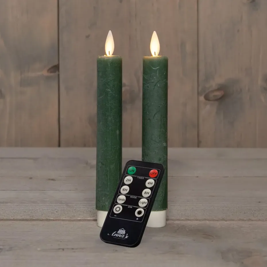 LED dinerkaarsen 2x stuks van 18 cm. Voeg een vleugje luxe toe aan je diner met deze set van 2x stuks dinerkaarsen in de kleur jade groen. Met een hoogte van 18 cm en LED bewegende vlam, zorg je voor een warme en elegante sfeer. Gemakkelijk te bedienen met de meegeleverde afstandsbediening, inclusief dimmer en timer functie. 2 AA batterijen per kaars worden niet meegeleverd. Laat de betovering van kaarslicht zonder zorgen om open vuur je tafel verfraaien met deze stijlvolle LED dinerkaarsen.