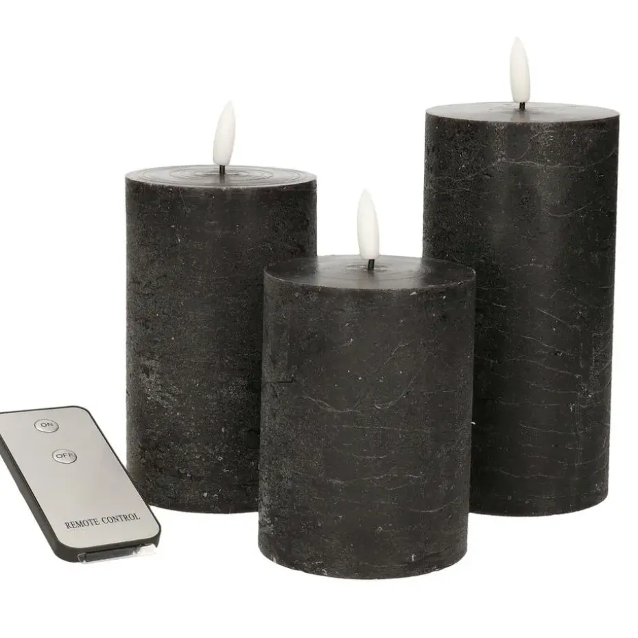 Anna’s Collection LED Stompkaarsen met afstandsbediening set van 3x stuks. Maten: D7,5 x H10 cm, D7,5 x H12,5 en D7,5 x H15 cm. Voeding: 3x AAA batterijen (niet inbegrepen). Ip-klasse: Ip20. Kleur licht: warm zwart.