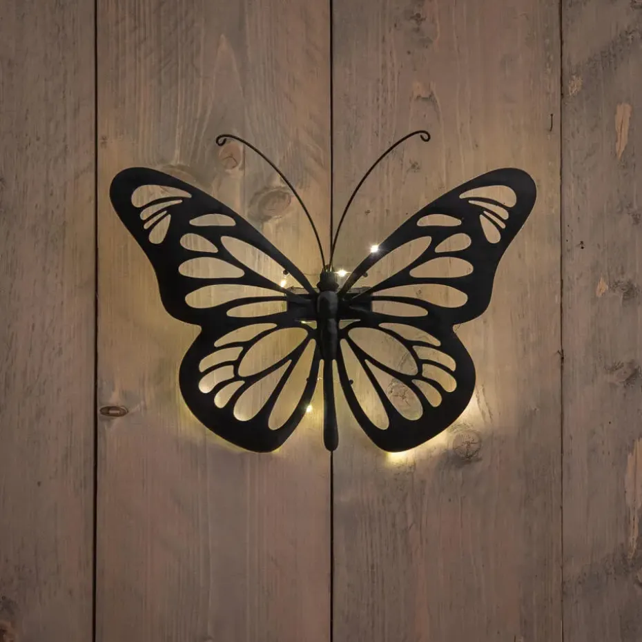 Fleur je tuin op met deze gezellige wandlamp/wanddecoratie vlinder! Bevestig de vlinder aan een muur of schutting bij je terras om altijd te genieten van de sfeerverlichting. De brandduur hangt af van de weersomstandigheden, 8 uur volle zon zorgt voor een maximaal aantal branduren. De buiten lamp heeft warm wit licht.