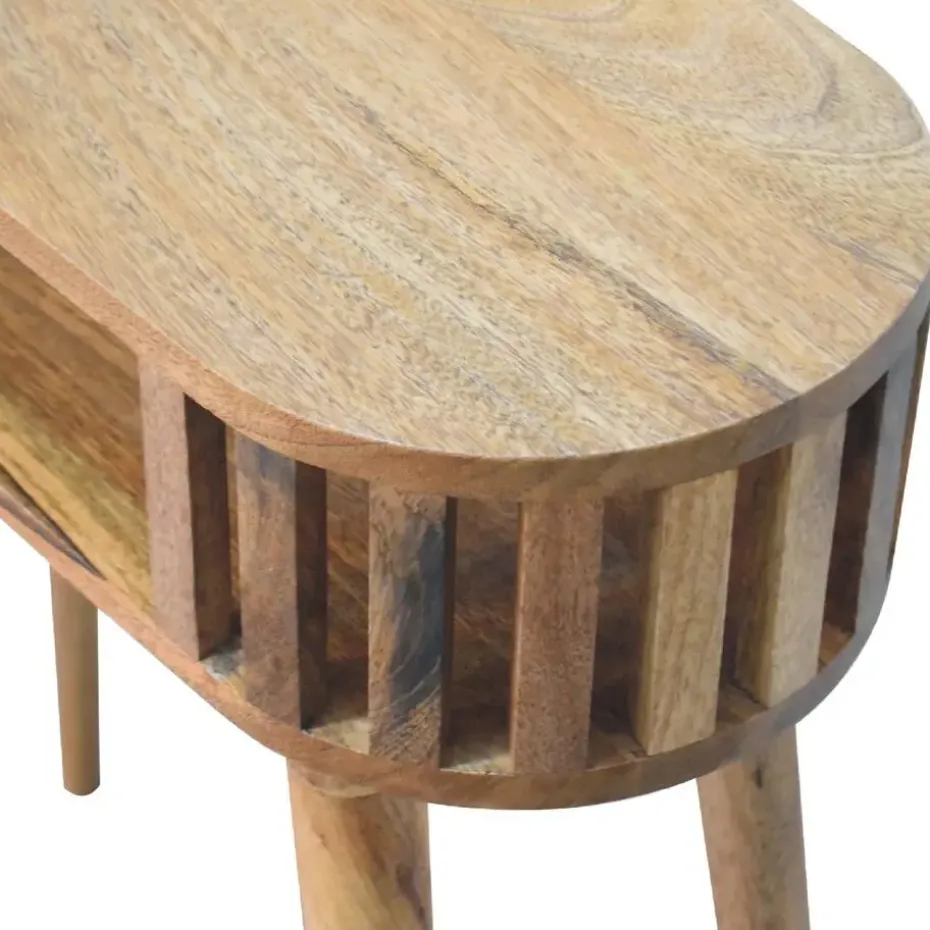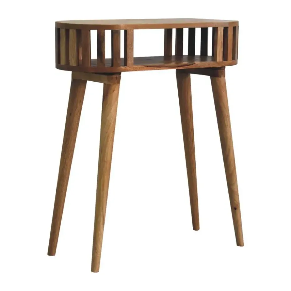 Geef je huis een update met onze Ariella sidetable met een eigentijds Japans ontwerp dat licht doorlaat en gemaakt is van 100% massief mangohout met een eikenhout-look afwerking. Dit meubelstuk heeft één open plank en bovenop ruimte om een plant, ornament of fotolijstje te plaatsen.